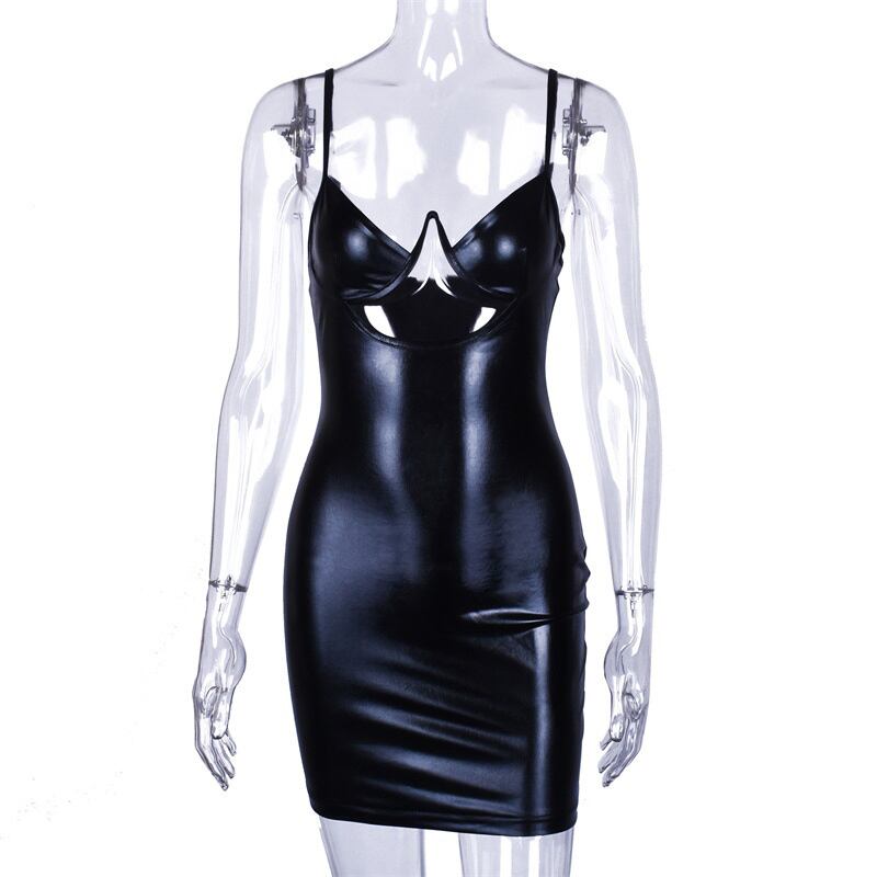 送料無料 Mozision セクシーなディープ V ネック PU レザードレス女性ローブ黒スパゲッティストラップノースリーブボディコンミニドレス Vestido ブラック Vネック AE121288813732290972