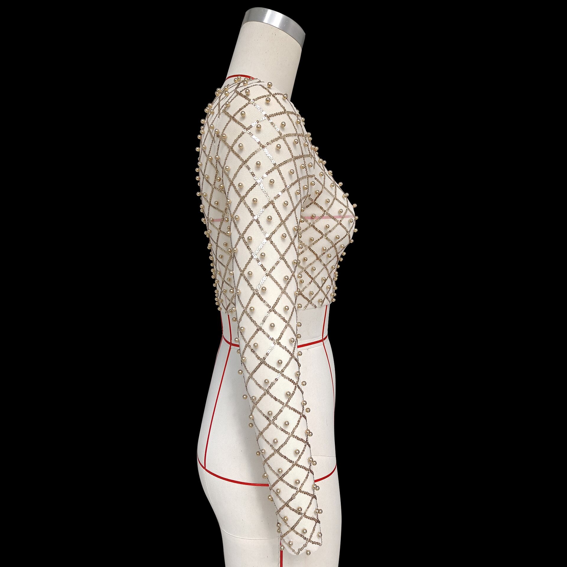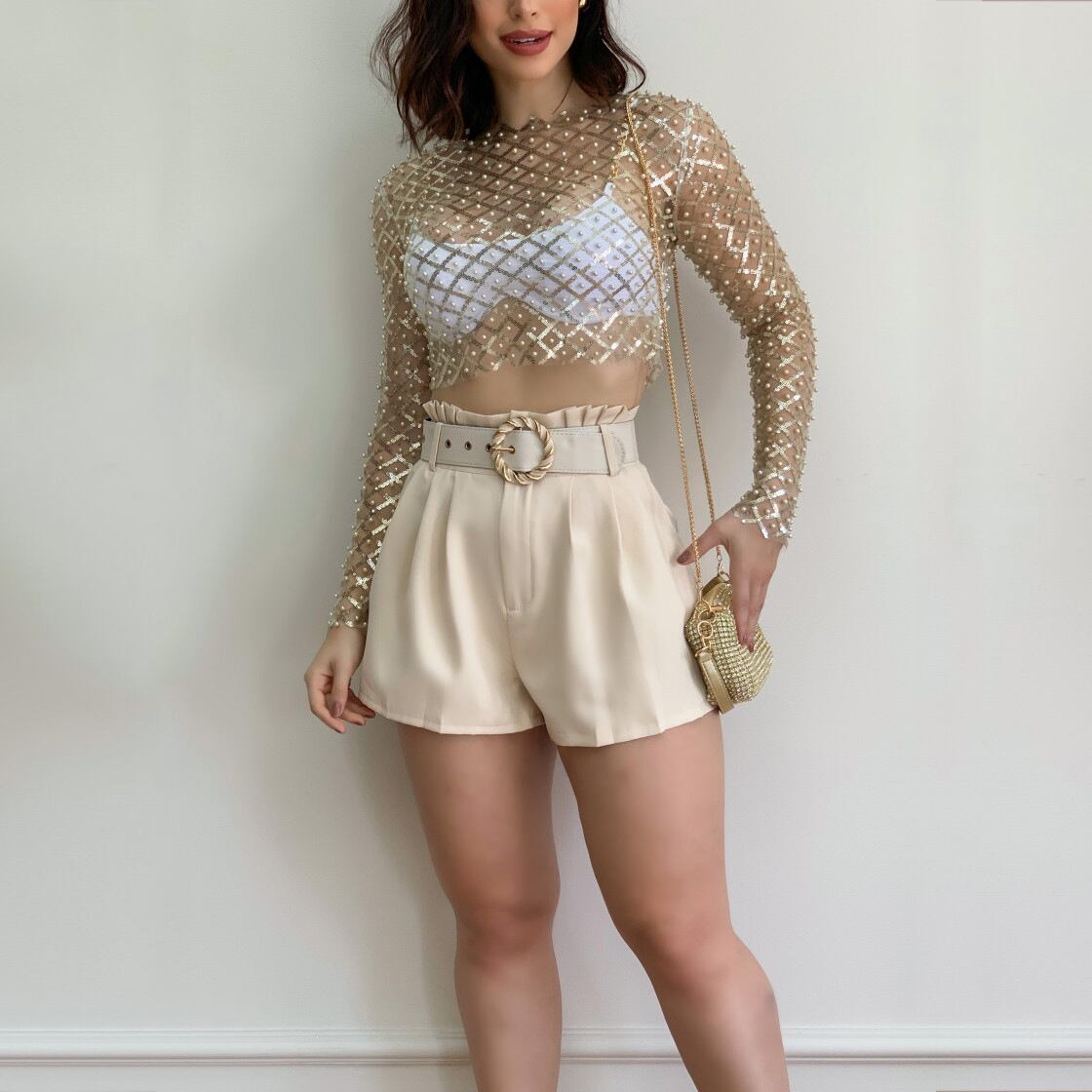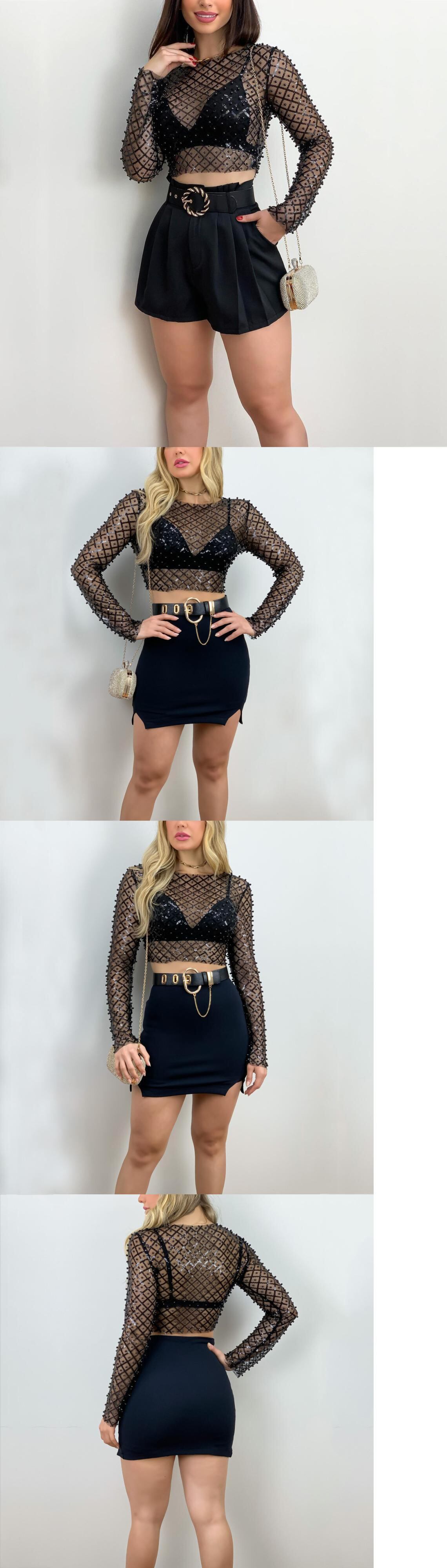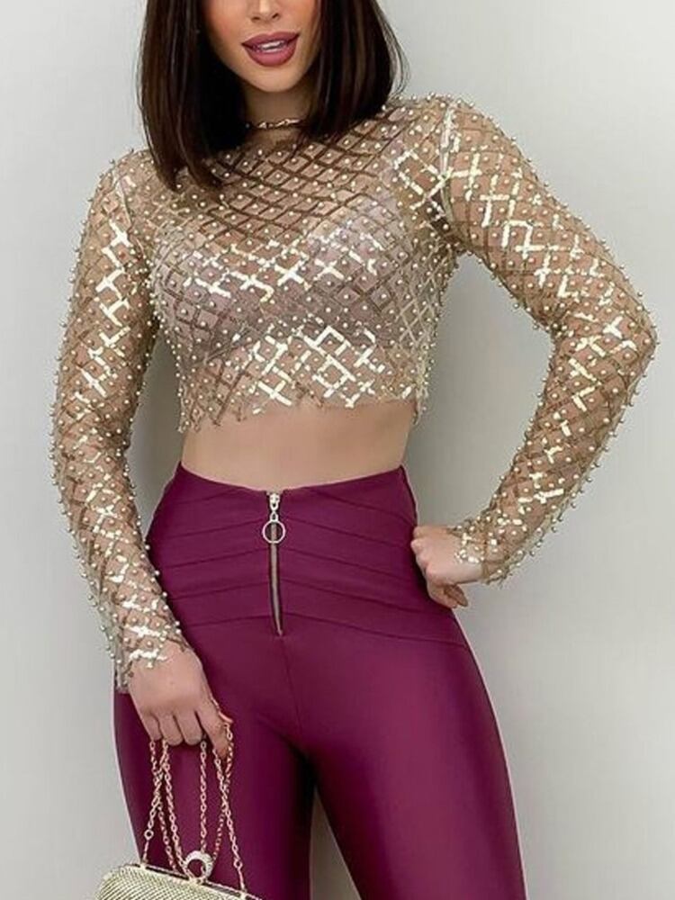 送料無料 Mozision 刺繍フレアグリッターセクシーな Tシャツ女性 O ネックフルスリーブクロップトップメッシュシャイニースリムパーティー Tシャツトップス レッド Oネック AE121288828918800112