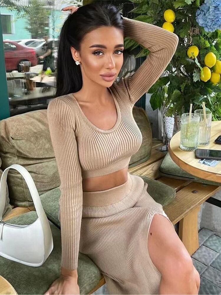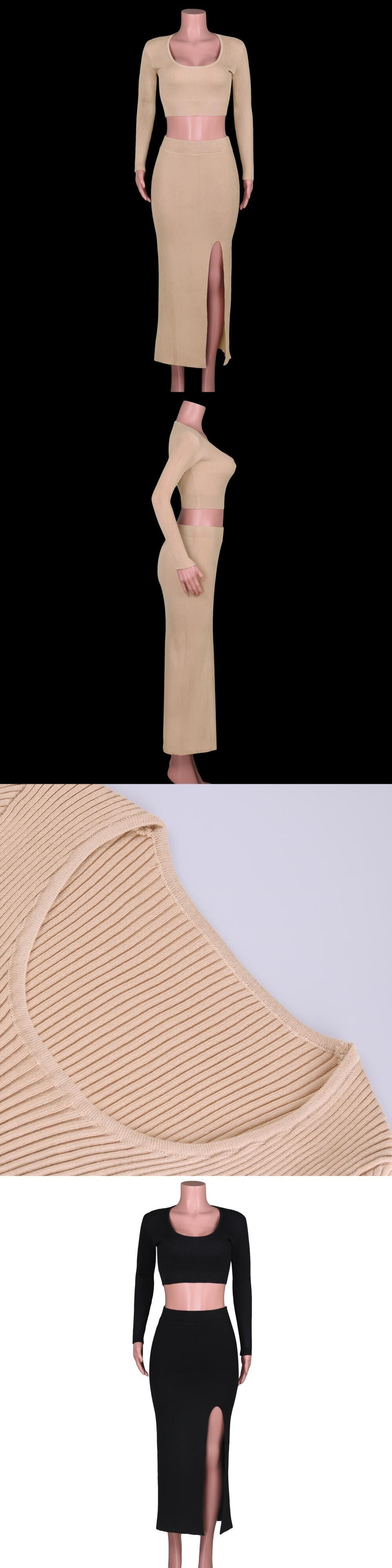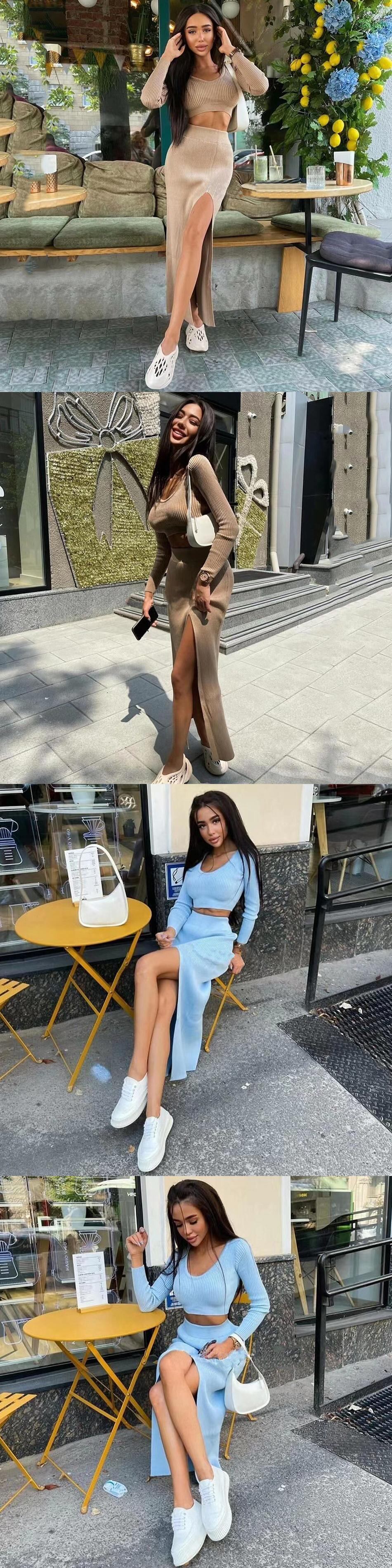 送料無料 Mozision 秋ドレスセット女性服 O ネックフルスリーブセーターとスプリットミディスカートマッチングセット 2 点セット オータム 秋物 Oネック AE121288897704513980
