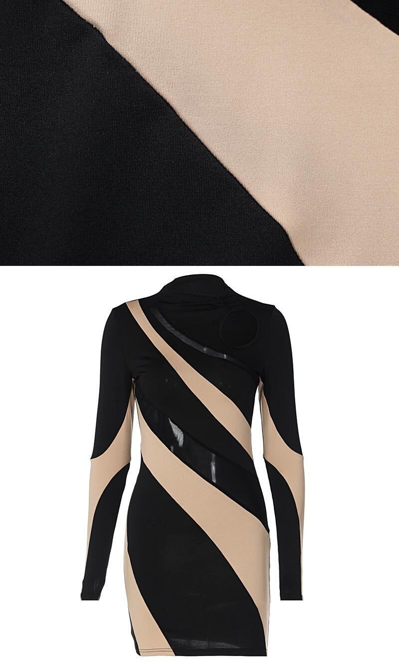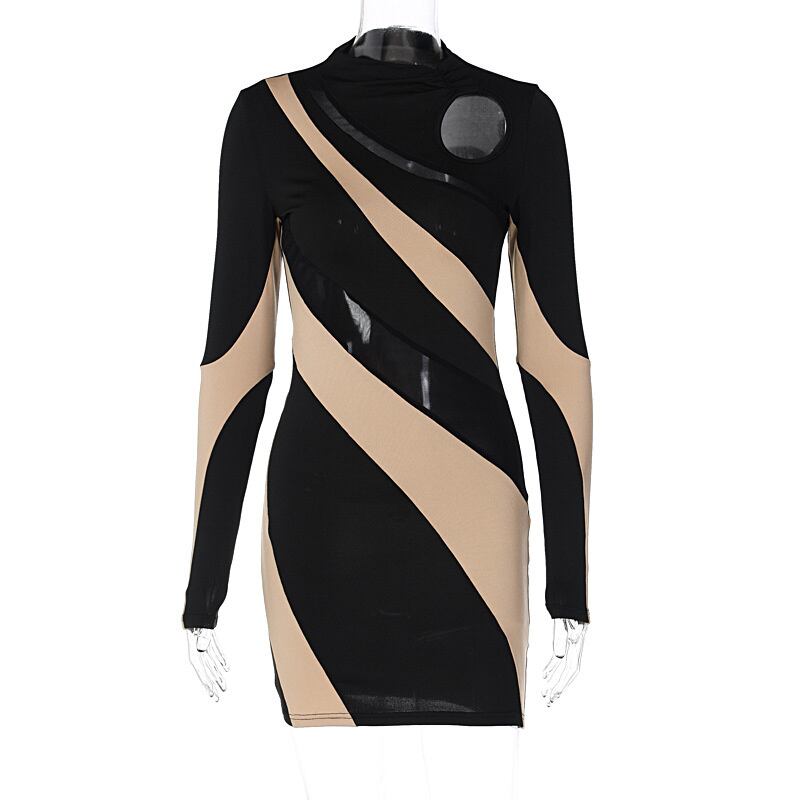 送料無料 Mozision 中空アウトパッチワークミニドレス女性ローブコントラストカラー O ネックフルスリーブボディコンセクシーなパーティーショートドレス Vestido Oネック AE121288868721422685
