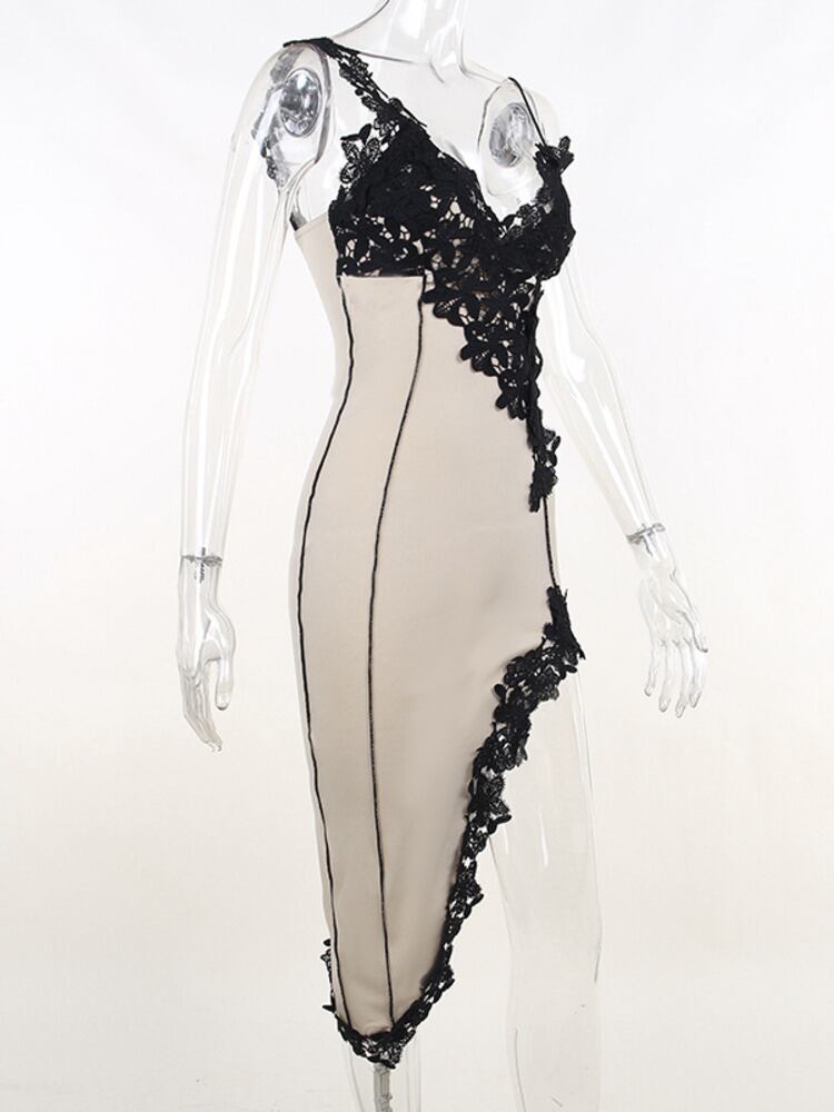 送料無料 Mozision レーススプリットセクシーなミディドレス女性ローブ 2023 スパゲッティストラップノースリーブディープ V ネックパーティーロングドレス Vestido Vネック AE121288853657266566