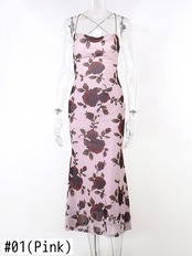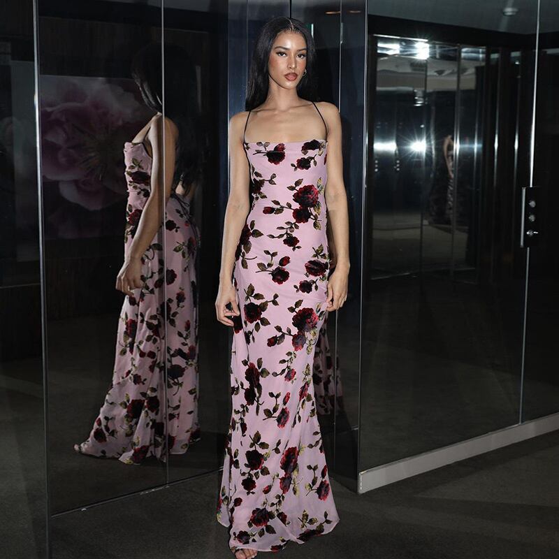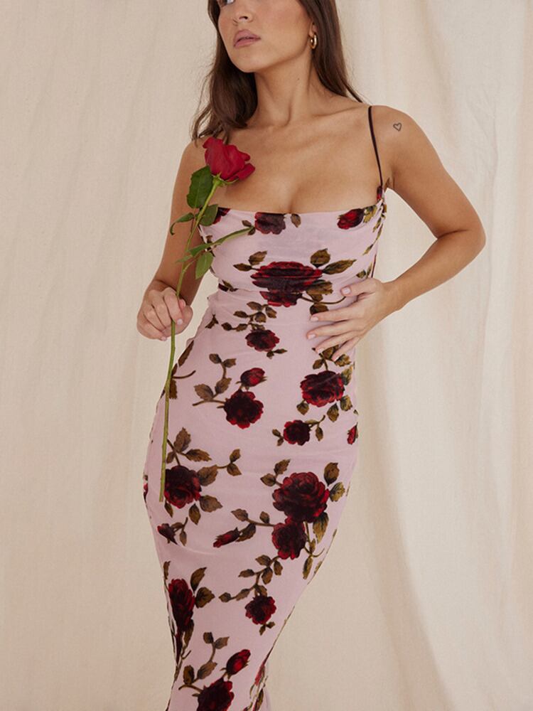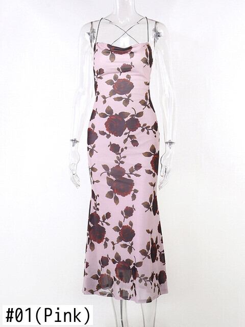 送料無料 Mozision 花柄ミディドレス女性ローブ 2023 スパゲッティストラップ背中の開いたノースリーブボディコンパーティーロングドレス AE121288875652725442