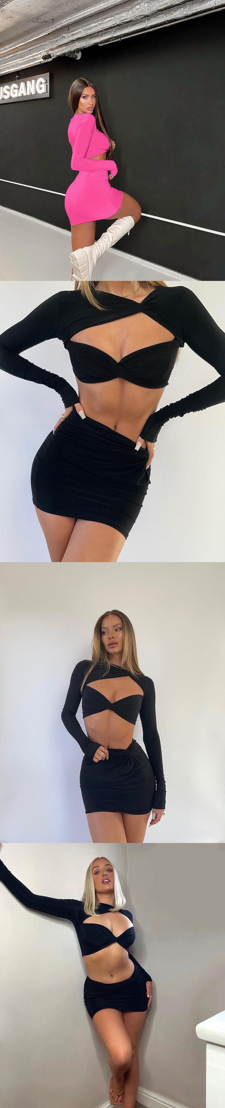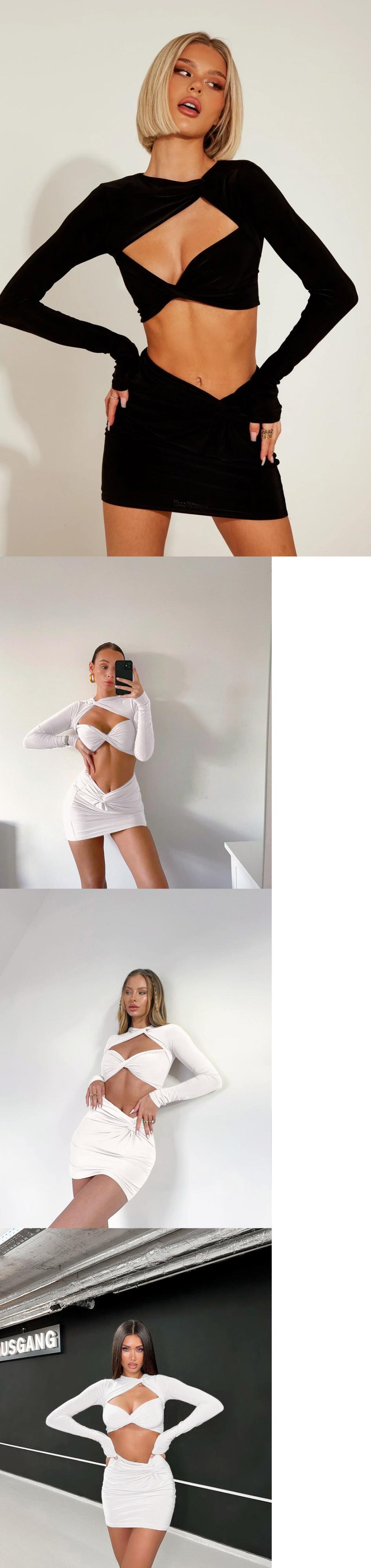 送料無料 Mozision セクシーなツーピースセット女性衣装中空アウトフルスリーブクロップトップとミニスカートマッチングスーツドレスセット AE121288862700663760