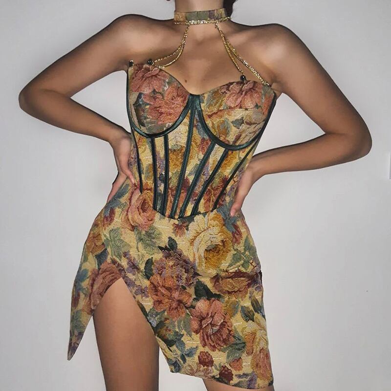 送料無料 Mozision ヴィンテージホルタープリントドレス女性 2022 夏オフショルダーノースリーブバックレスボディコンスプリットミニドレス サマー 夏物 ビンテージ AE121288871715142500