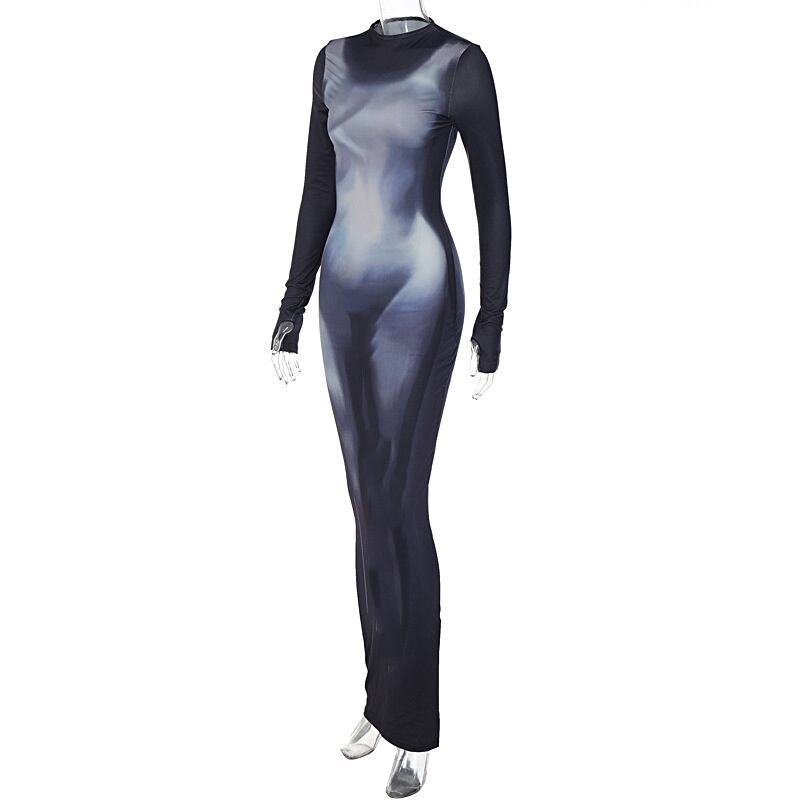 送料無料 Mozision 絞り染めプリントマキシドレス女性ローブ春 O ネックフルスリーブボディコンパーティーロングドレス Vestido スプリング 春物 Oネック AE121288842169949632