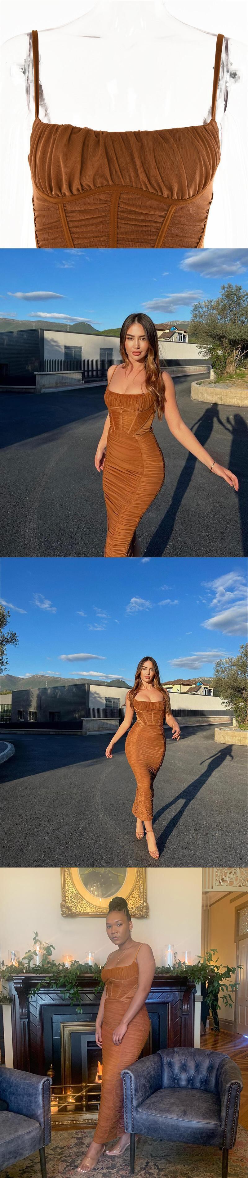 送料無料 Mozision コルセットシャーリングマキシドレス女性スパゲッティストラップノースリーブバックレスジッパーロングドレス Vestido AE121288822896913713