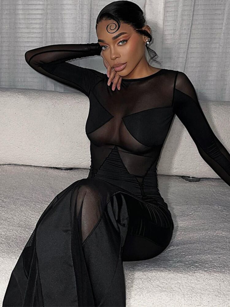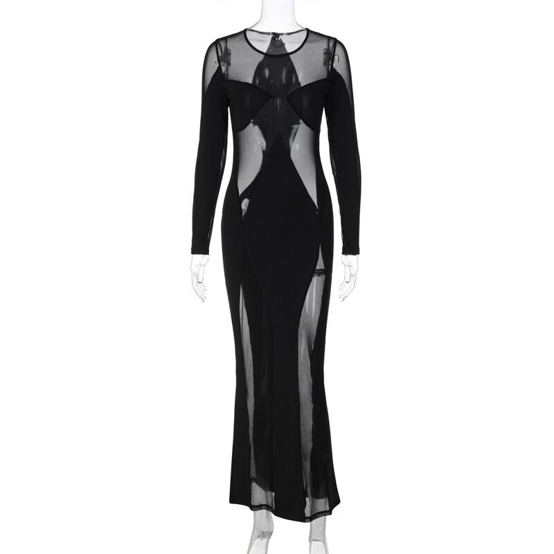 送料無料 Mozision シアーメッシュシースルーマキシドレス女性 2023 O ネック長袖ボディコンパーティーセクシーなロングドレス Vestidos Oネック AE121288892783863771