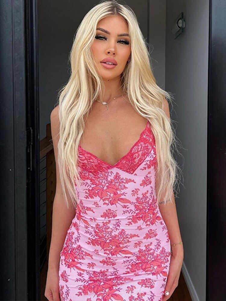 送料無料 Mozision ピンクプリントスパゲッティストラップミディドレス女性 2023 夏ノースリーブ背中ボディコンプリントロングドレス Vestido サマー 夏物 AE121288814237022397