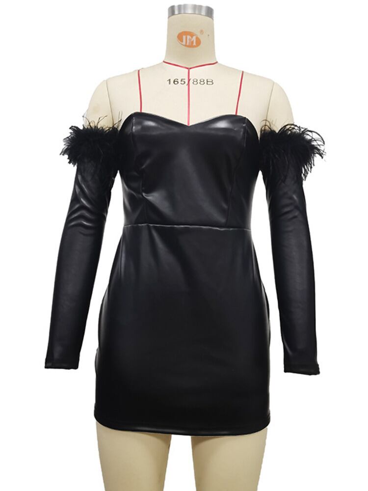 送料無料 Mozision オフショルダーフェザースリーブ PU レザーミニドレス女性ローブストラップレス背中の開いたセクシーなパーティーショートドレス Vestido AE121288855113561720