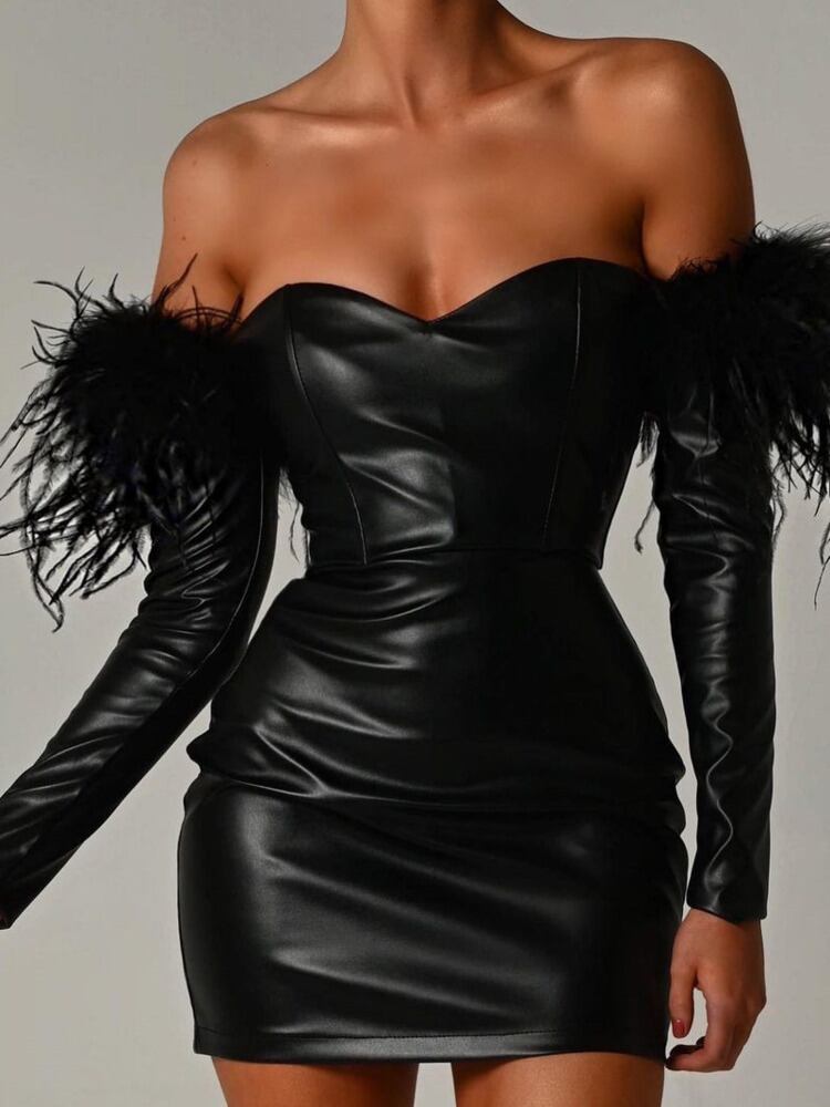 送料無料 Mozision オフショルダーフェザースリーブ PU レザーミニドレス女性ローブストラップレス背中の開いたセクシーなパーティーショートドレス Vestido AE121288855113561720 | 女性の為の通販サイト-fashion navi