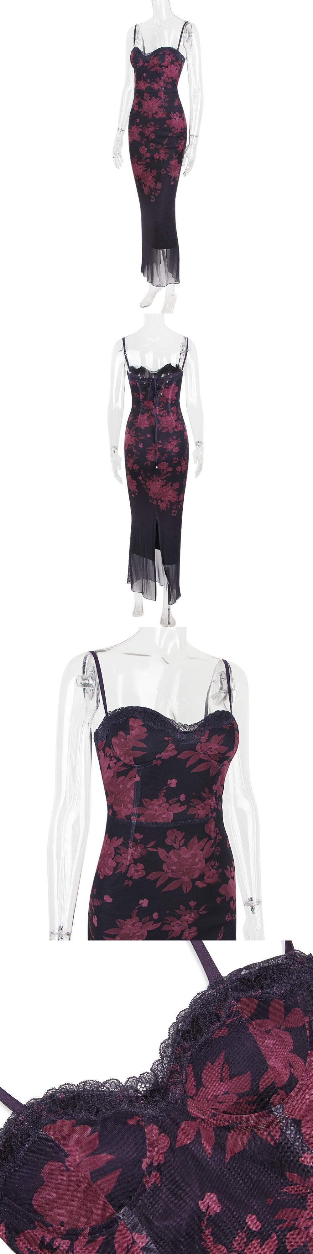 送料無料 Mozision パープルプリントセクシーなロングフィッシュテイルドレス女性ローブ 2023 スパゲッティストラップノースリーブバックレスシャーリングマキシドレス AE121288890830153410