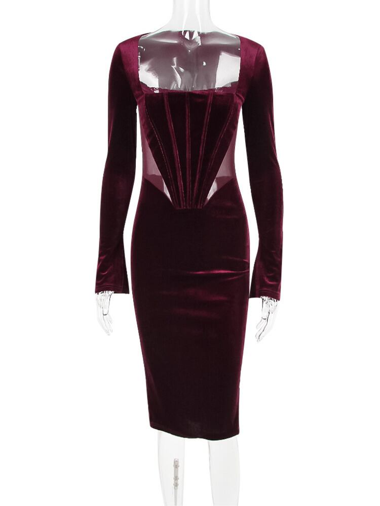 送料無料 Mozision ベルベットボディコンコルセットセクシーなミディドレス女性ローブ 2023 スクエアカラーフルスリーブクラブパーティーロングドレス Vestido スクウェア AE121288894091905539