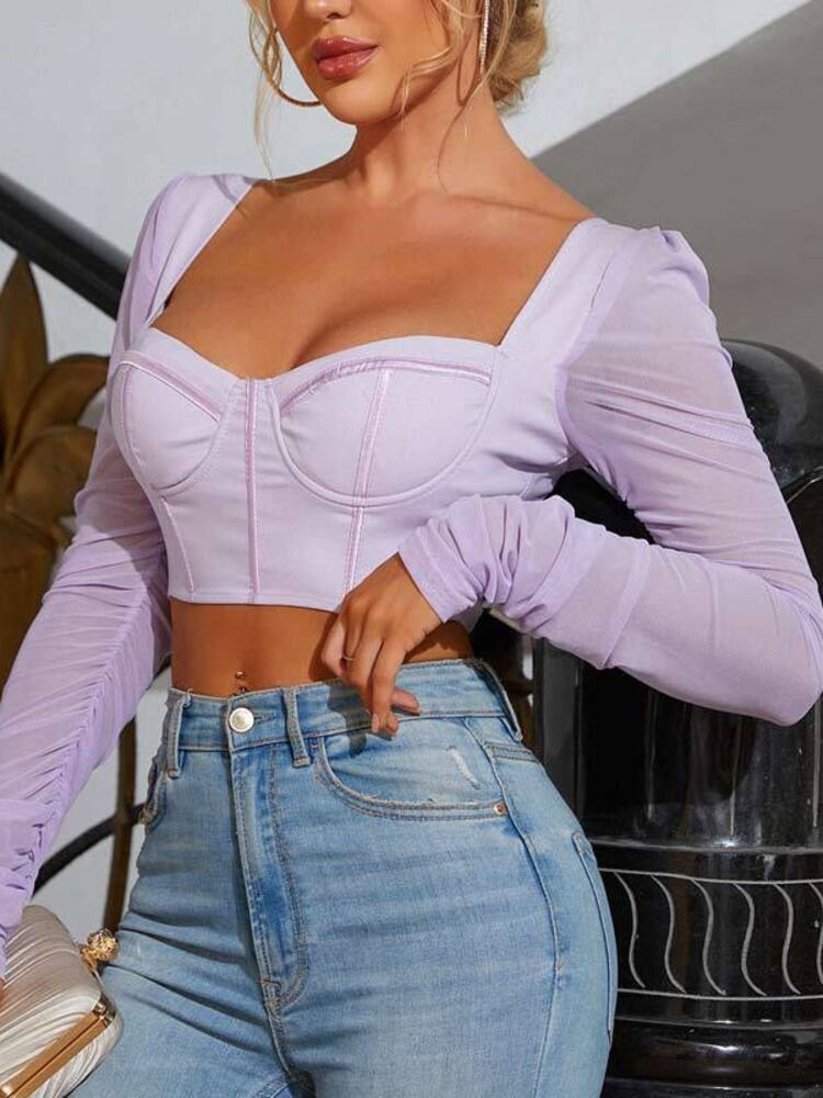 送料無料 Mozision メッシュ長袖スクエアカラー Tシャツ女性クロップドトップス夏ジッパークロップトップクラブパーティートップス ロング サマー 夏物 スクウェア AE121288871639054613