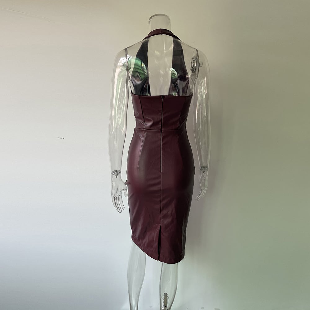 送料無料 Mozision ホルターディープ V ネック PU レザーセクシーなミディドレス女性ローブレッドノースリーブバックレスボディコンパーティードレス Vestido Vネック AE121288830946155147