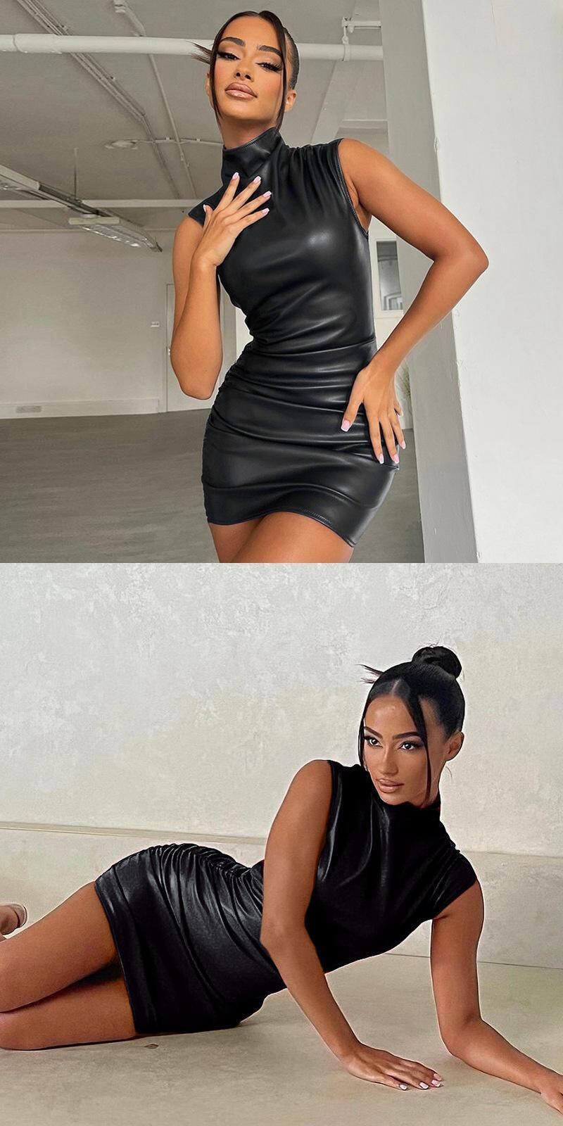 送料無料 Mozision 冬のノースリーブ PU レザーミニドレス女性ローブタートルネックボディコンシャーリングセクシーなショートドレス Vestido ウィンター 冬物 AE121288834279573135