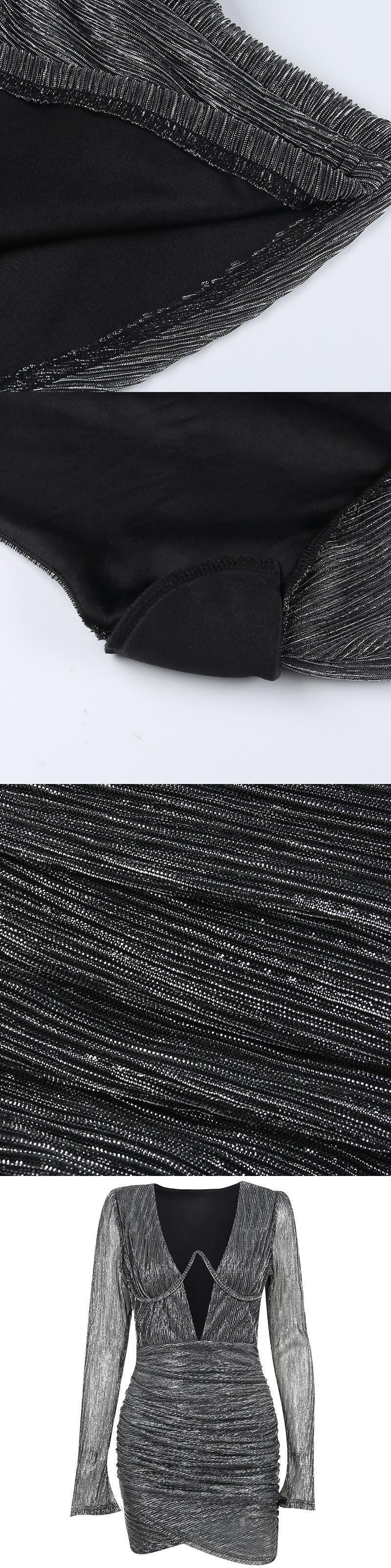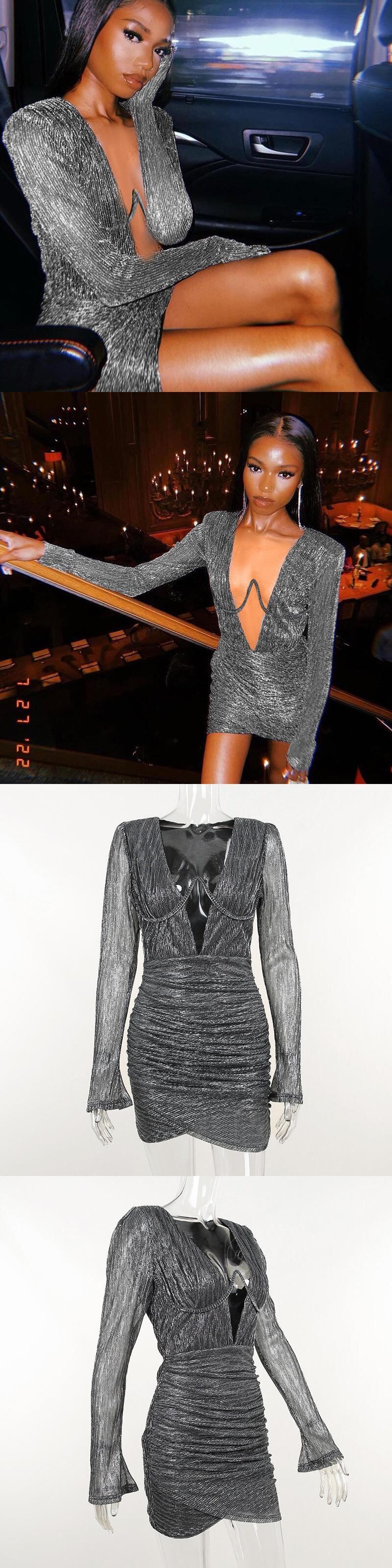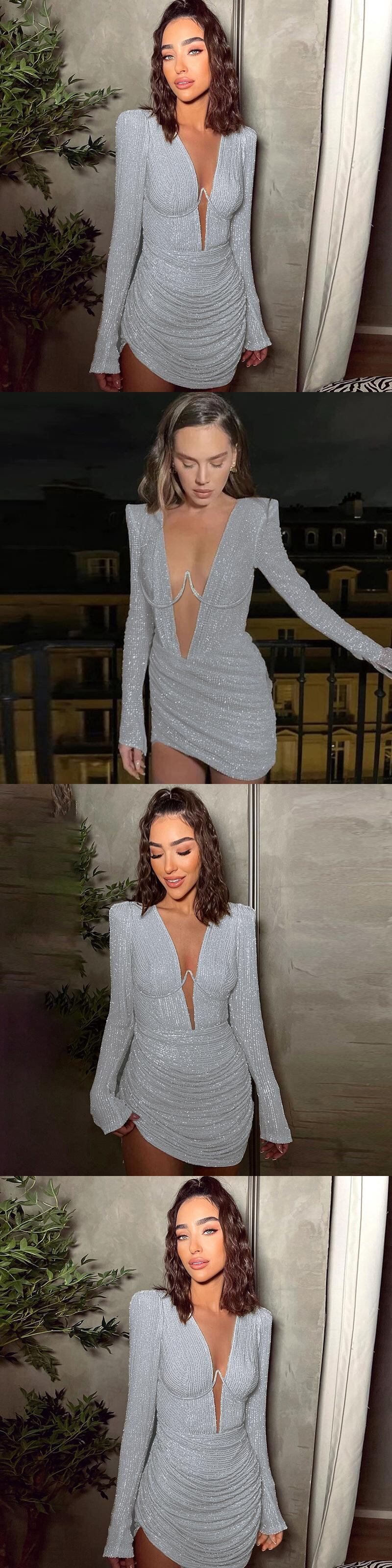 送料無料 Mozision 2022 秋のディープ V 襟フルスリーブミニドレスの女性のガウンセクシーなシャーリングクラブパーティードレスの服 オータム 秋物 AE121288885501747764