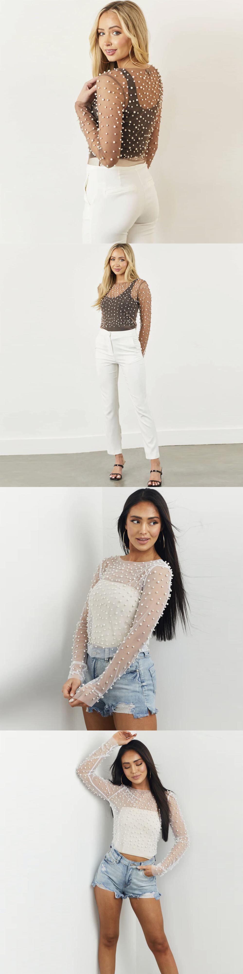 送料無料 Mozision パールメッシュシースルー Tシャツ女性長袖プルオーバーブラウス夏 U ネックセクシーな Tシャツトップス ロング サマー 夏物 真珠 AE121288892972732223