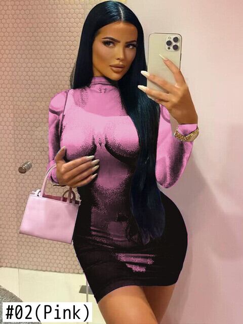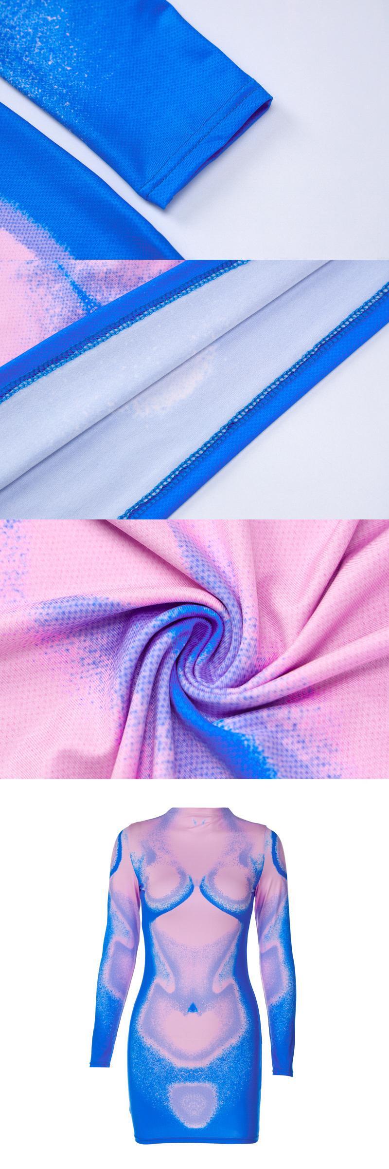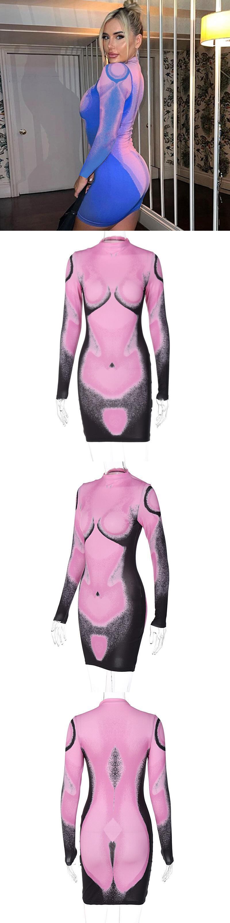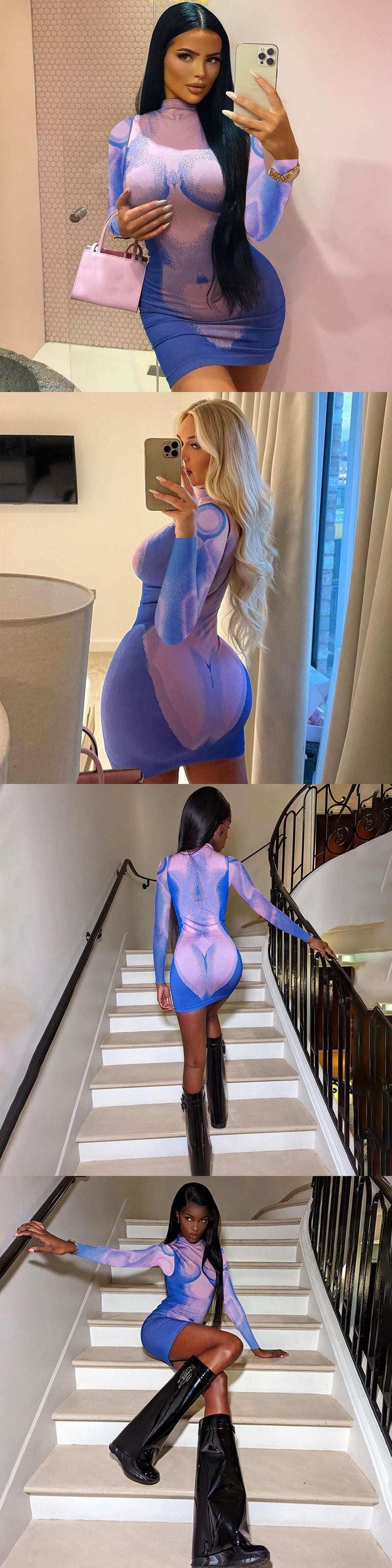 送料無料 Mozision タイダイストライププリントミニドレス女性 O ネックフルスリーブボディコンセクシーなショートドレスプリントスキニードレス Oネック AE121288896714960614