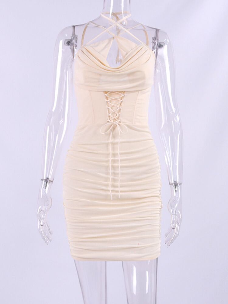 送料無料 Mozision メッシュ中空アウト背中の開いたセクシーなミニドレス女性ローブホルターレースアップノースリーブボディコンクラブパーティードレス Vestido AE121288864966780081