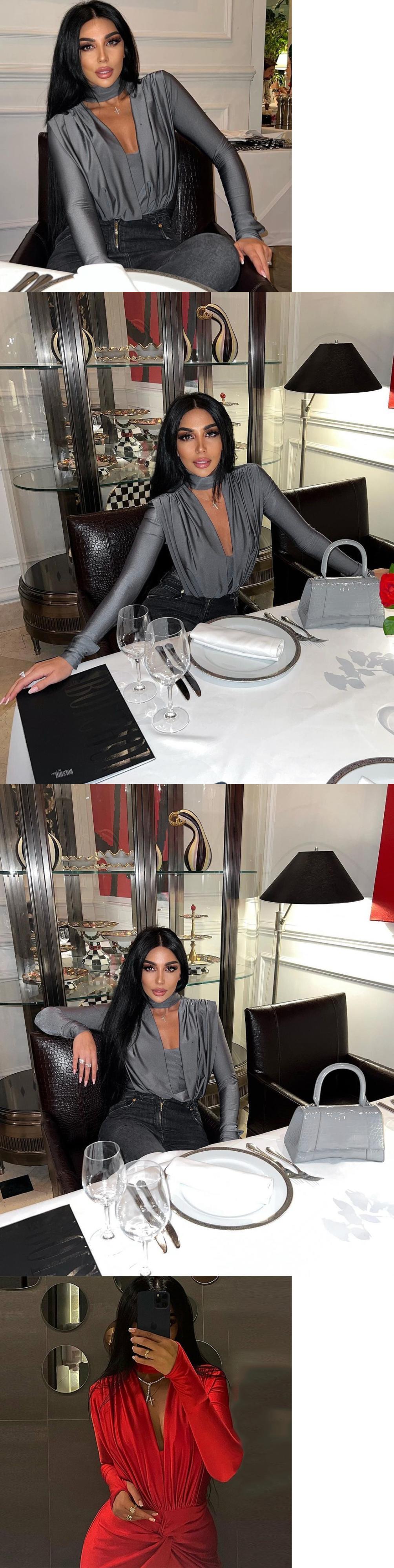 送料無料 Mozision ディープ V ネックフルスリーブセクシーなボディスーツ女性ロンパース冬スキニーパーティープリーツボディスーツ Tシャツクラブウェア ウィンター 冬物 Vネック AE121288872873029851