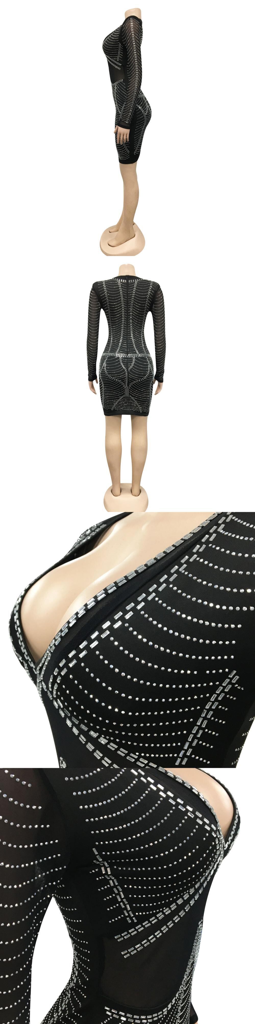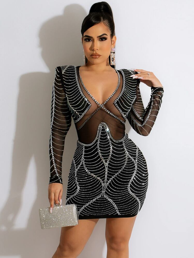 送料無料 Mozision グリッターダイヤモンドシースルーメッシュセクシーなパーティードレス女性 2023 V ネックショルダーパッドクラブイブニングドレス Vestido Vネック AE121288860421717824