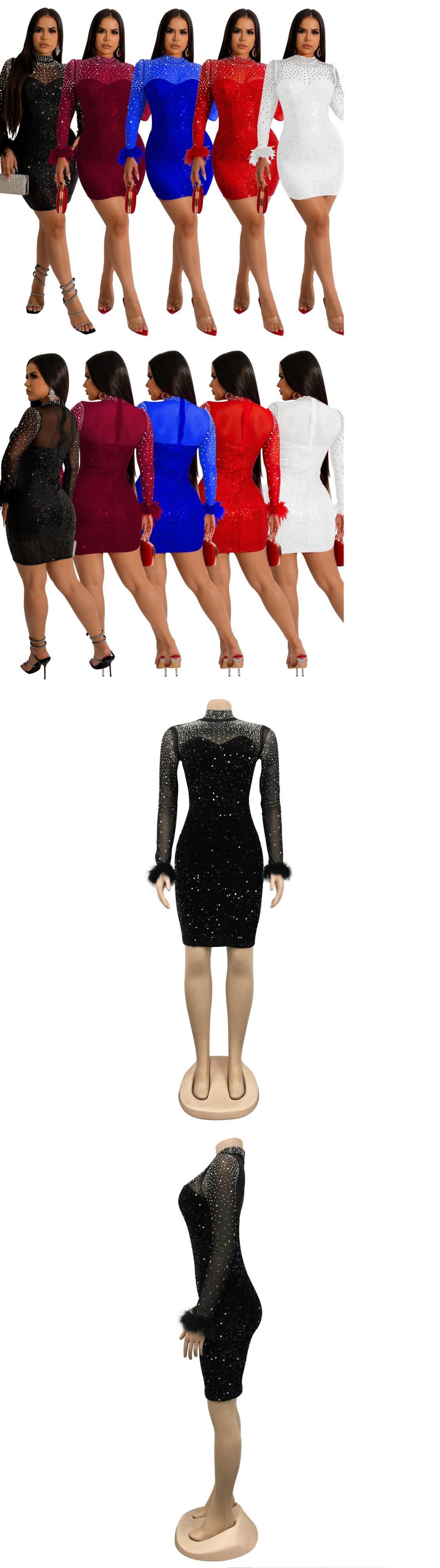 送料無料 Mozision セクシーなホットドリル羽長袖シースルードレス女性ミニドレス秋登るクラブパーティー衣装ローブ ロング オータム 秋物 AE121288848275490415