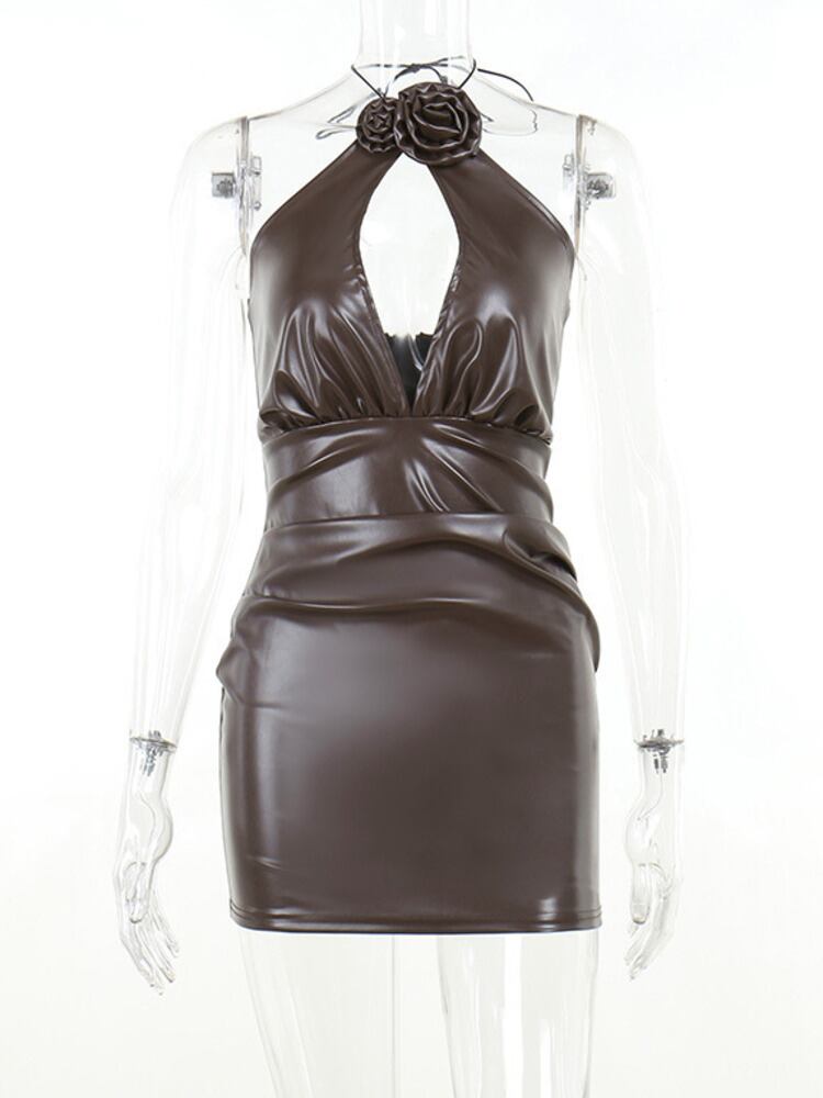 送料無料 Mozision 中空アウトフレアミニドレス女性ローブホルターノースリーブバックレスボディコン PU レザーショートドレス Vestido AE121288842267198636