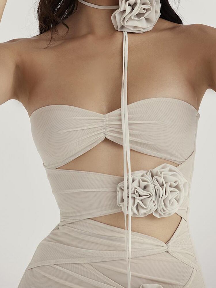送料無料 Mzoision 中空アウト花セクシーなミニドレス女性二層メッシュジッパーストラップレスバックレスボディコンクラブパーティードレス Vestido フラワーデザイン AE121288890823775502