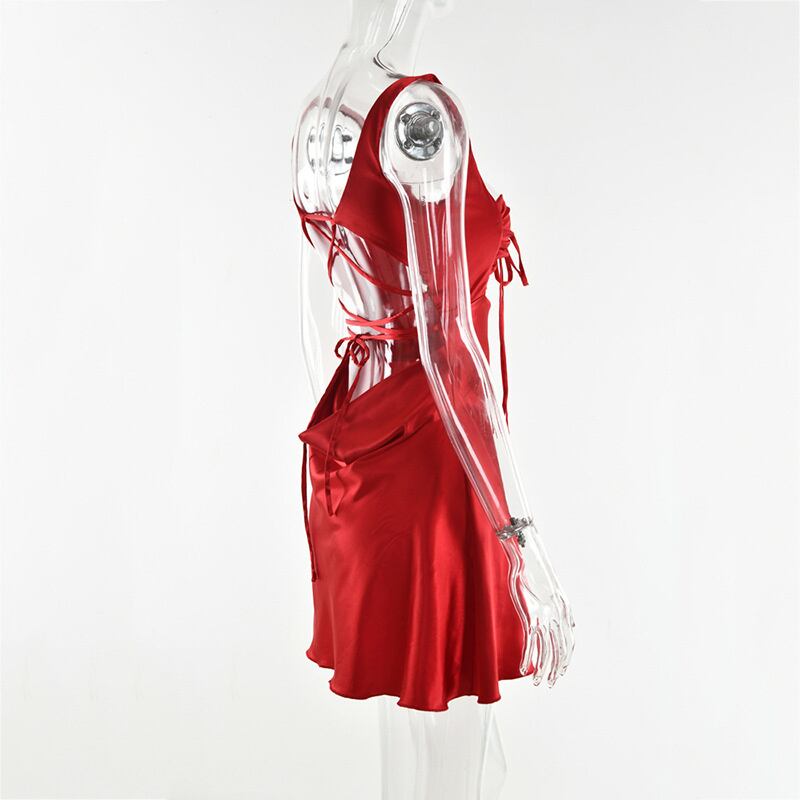 送料無料 Mozision サテン中空アウトドローストリング胸ラッピングミニドレス女性のセクシーなスリムパーティースパゲッティストラップ背中の開いたドレス Vestidos AE121288815292705368