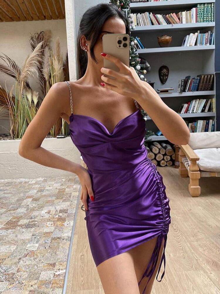 送料無料 Mozision サテン背中の開いた巾着シャーリングミニドレス女性の夏のスパゲッティストラップノースリーブボディコンセクシーなドレス Vestidos サマー 夏物 AE12128887612606408