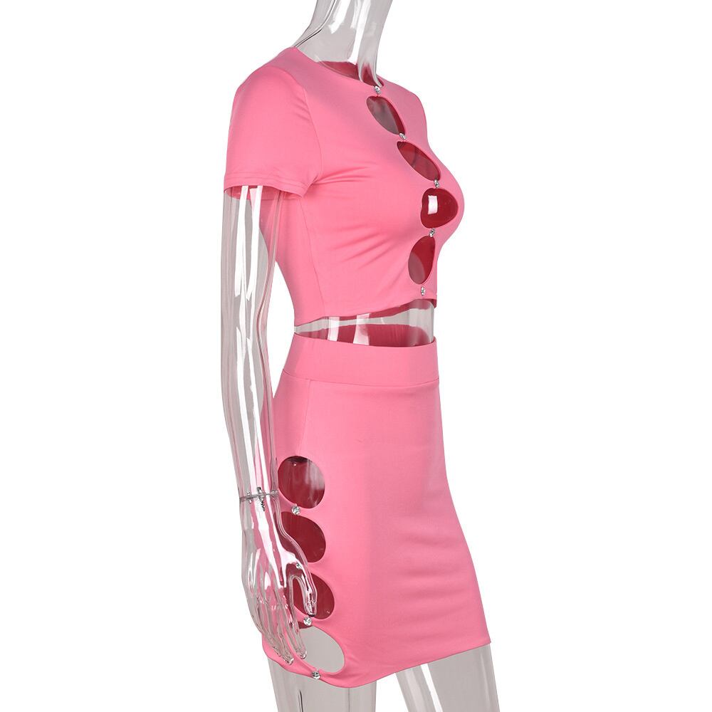 送料無料 Mozision セクシーなツーピースセット女性 2022 夏ピンク中空アウト半袖 Tシャツとミニスカートスーツスカートセット ショート ハーフスリーブ サマー 夏物 AE121288842912870423