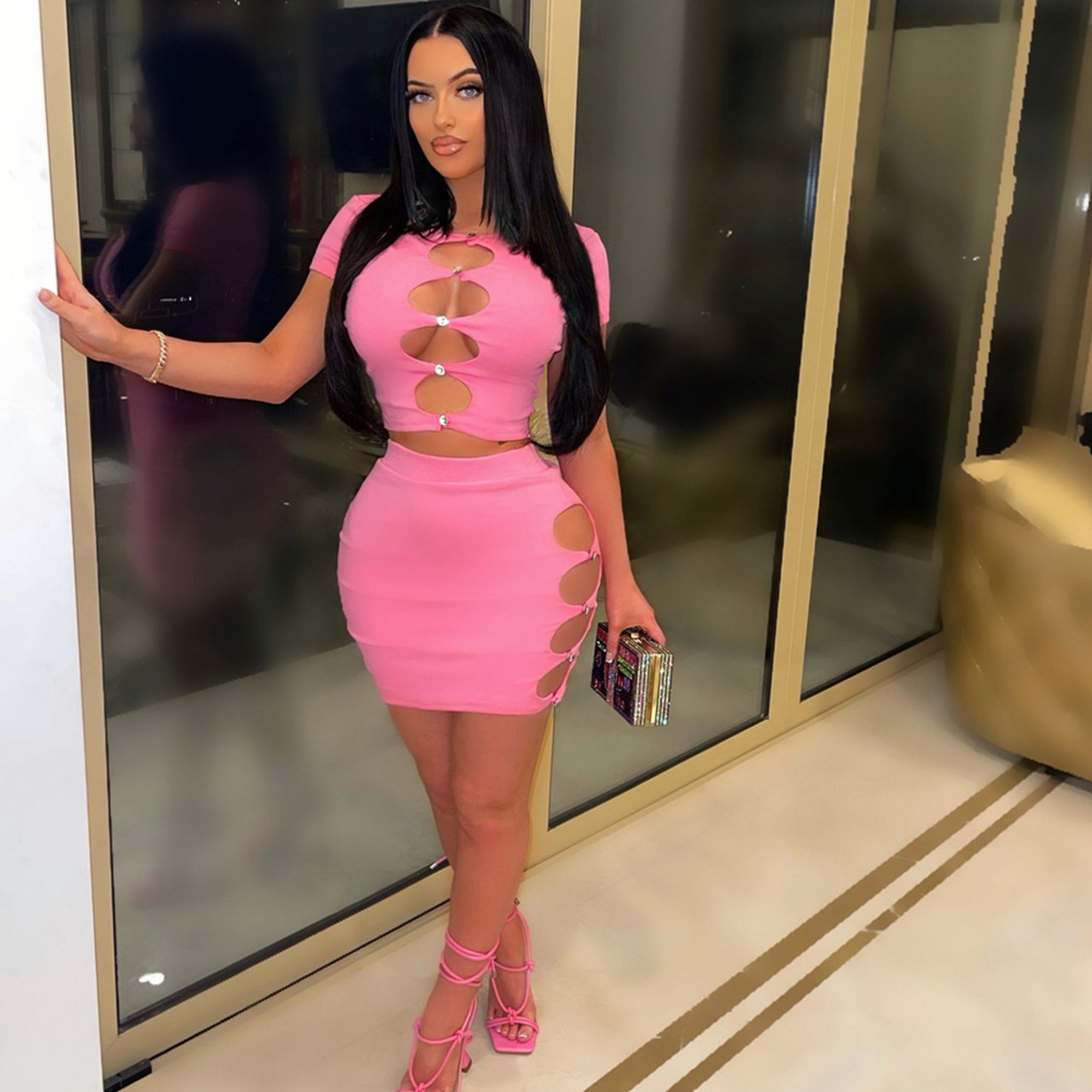送料無料 Mozision セクシーなツーピースセット女性 2022 夏ピンク中空アウト半袖 Tシャツとミニスカートスーツスカートセット ショート ハーフスリーブ サマー 夏物 AE121288842912870423 | 女性の為の通販サイト-fashion navi