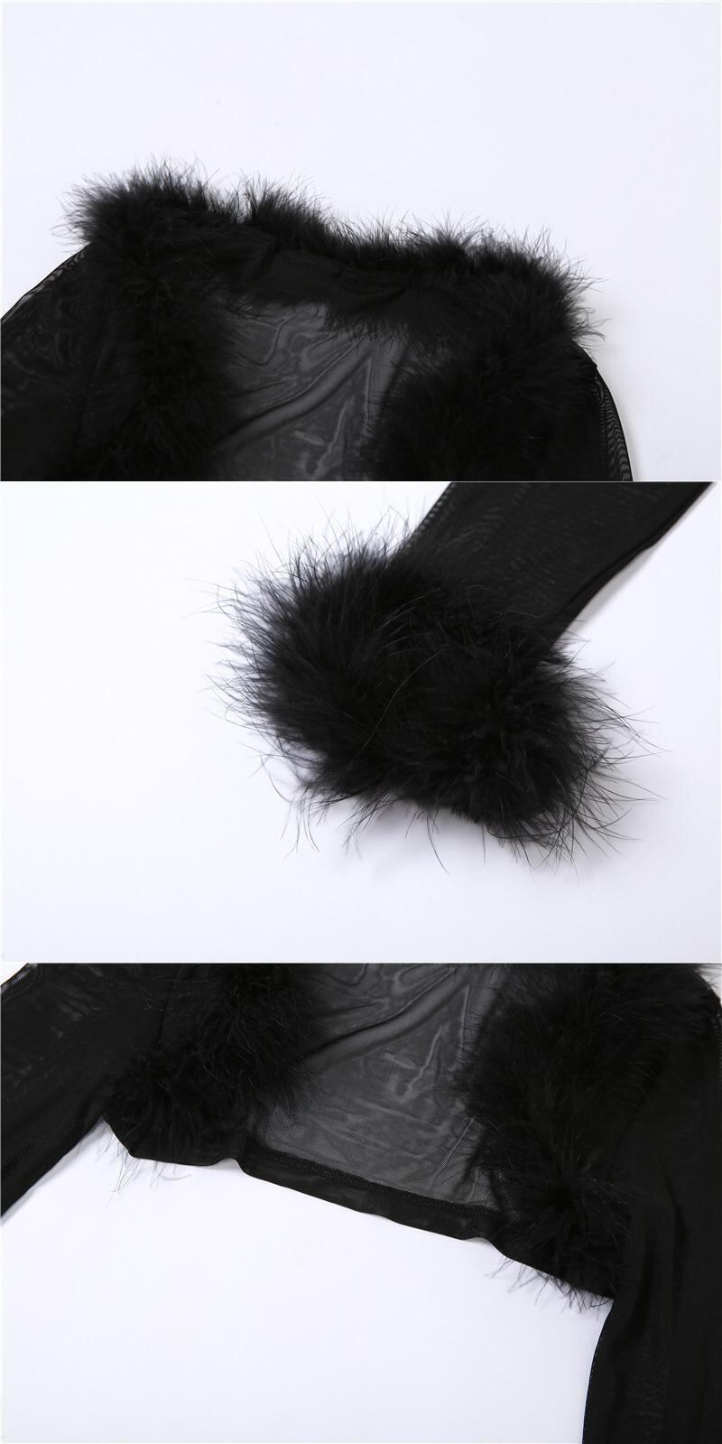 送料無料 Mozision 黒メッシュドレスセット女性フェザースリーブ Tシャツとドレススーツセクシーなパーティー 2 点セット衣装 ブラック AE121288896473384701