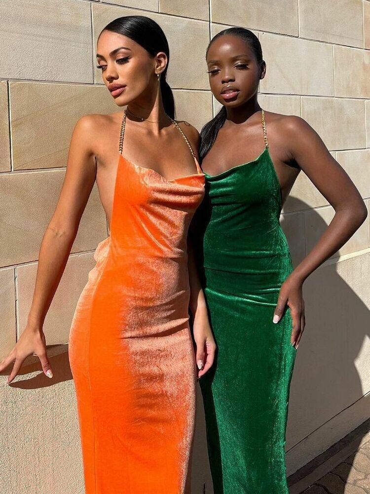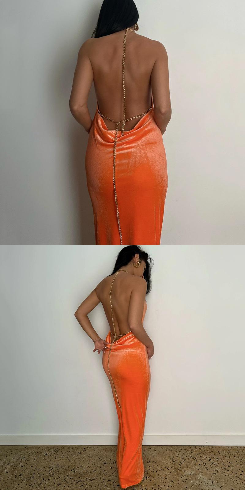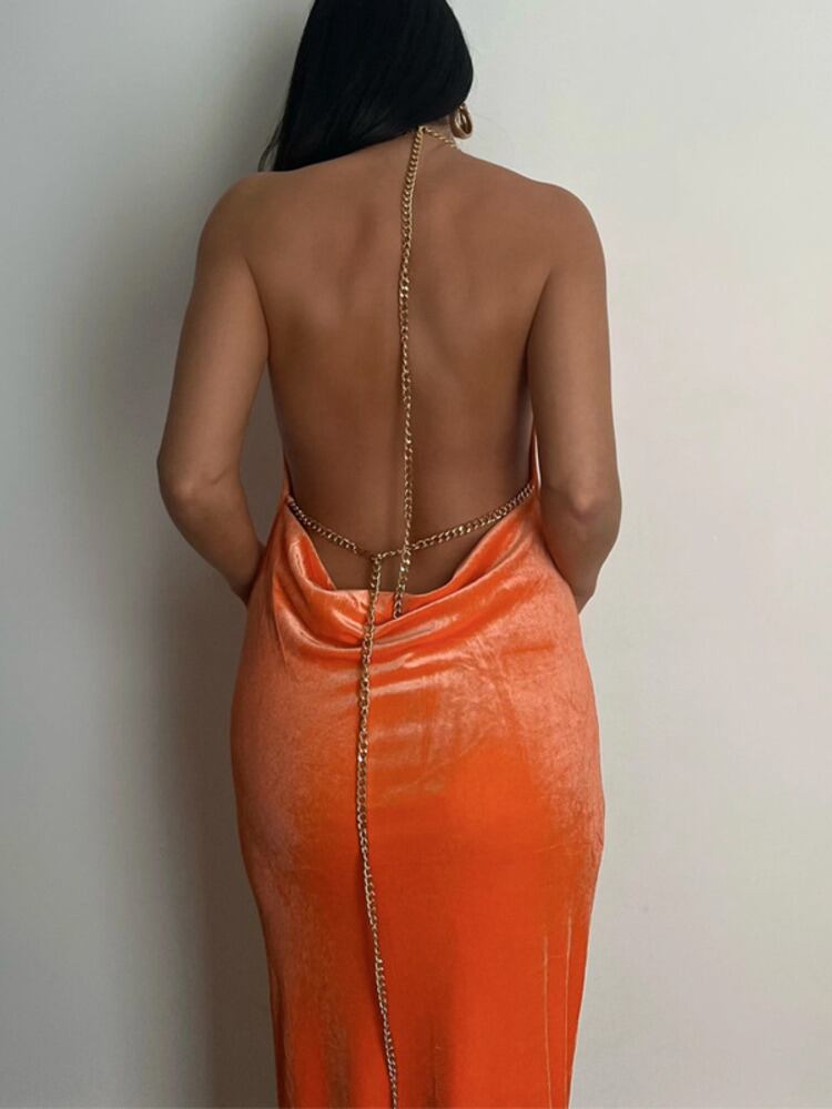 送料無料 Mozision ベルベット金属チェーン背中の開いたミディドレス女性 2022 秋ノースリーブボディコンセクシーなロングドレス Vestido オータム 秋物 AE121288823050530208