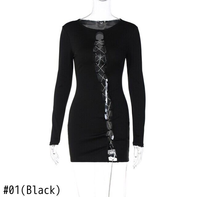 送料無料 Mozision 黒中空アウトミニドレス女性ローブダイヤモンドチェーン O ネックフルスリーブボディコンセクシーなパーティーショートドレス Vestido ブラック Oネック AE121288879205351035