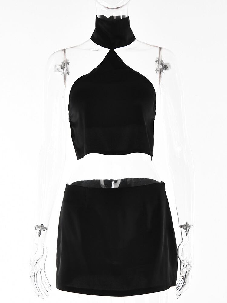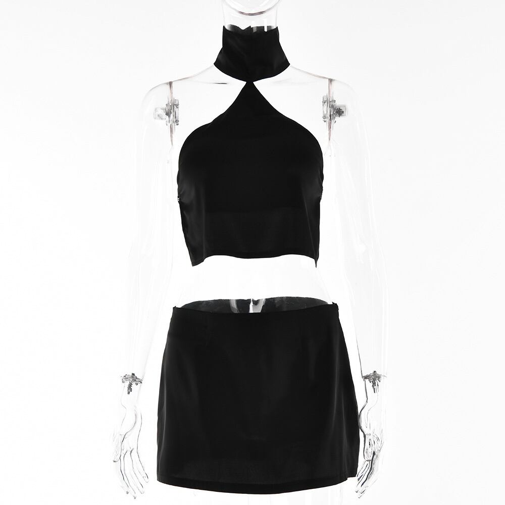 送料無料 Mozision 2022 サテン中空アウト二枚スーツ女性スパゲッティストラップノースリーブクロップトップミニスカートセット秋のセクシーなスーツ オータム 秋物 AE121288866988033366