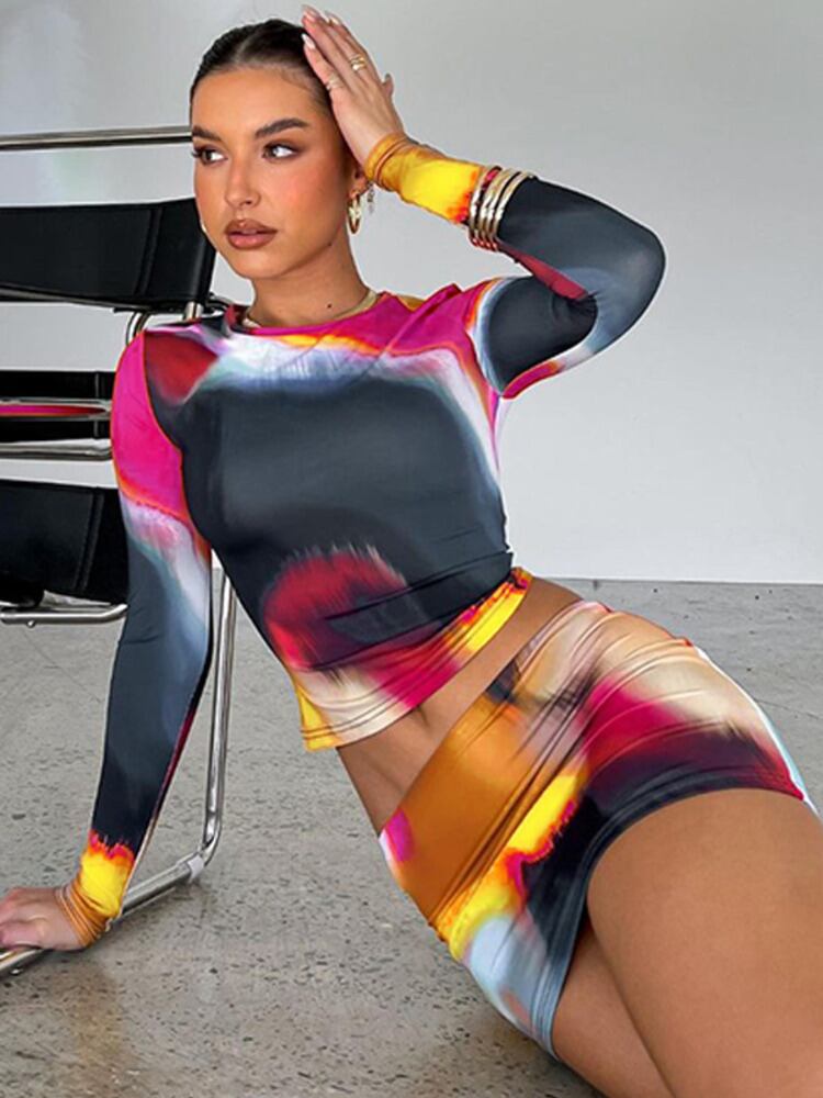 送料無料 Mozision 秋プリント 2 点セット女性衣装 O ネックフルスリーブクロップトップとミニスカートマッチングセットドレス オータム 秋物 Oネック AE121288853125153852