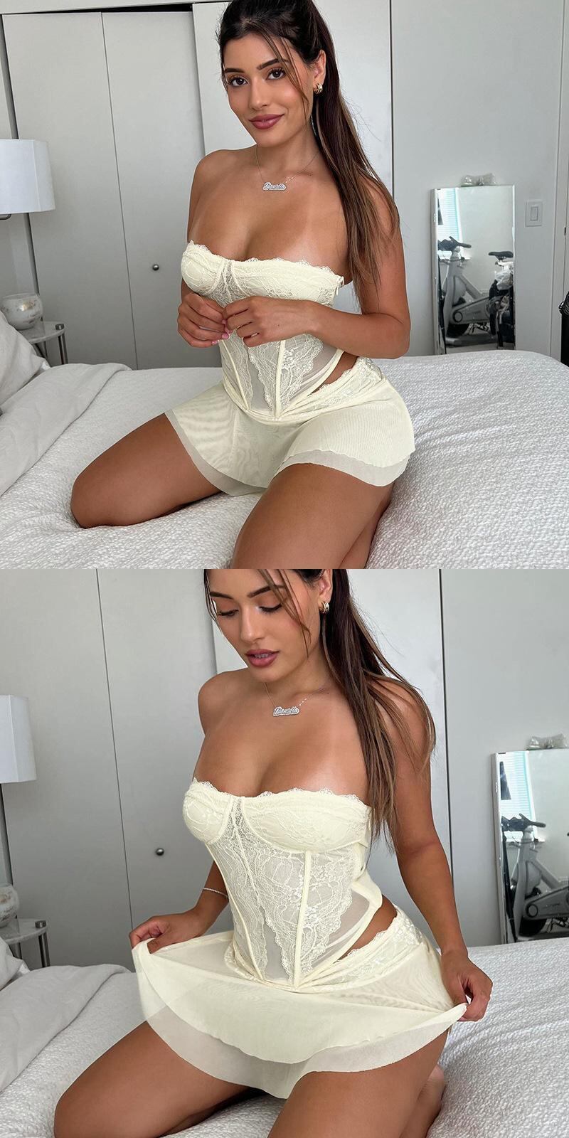 送料無料 Mozisiom Sexylace シースルーツーピースセット女性 2022 秋のクロップトップとミニスカートマッチングセットドレスセット レース オータム 秋物 AE121288870920500391