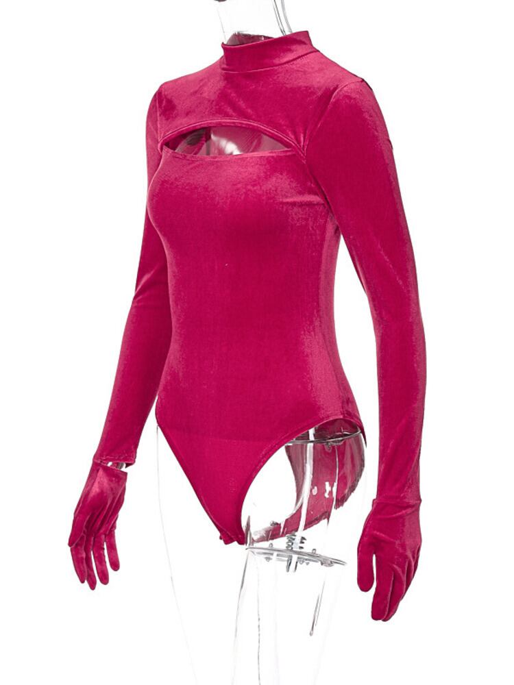 送料無料 Mozision 2022 ベルベット中空アウトセクシーなボディスーツ女性ローズピンクターンテーブルスキニーフルスリーブ手袋ロンパースクロップドトップス AE121288833379723373