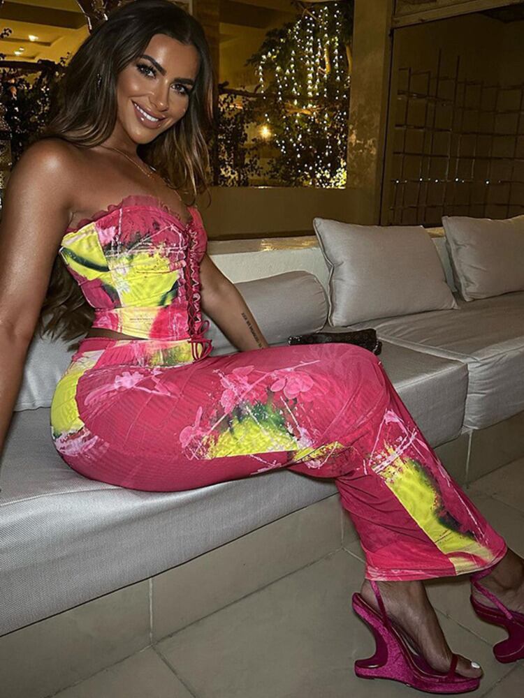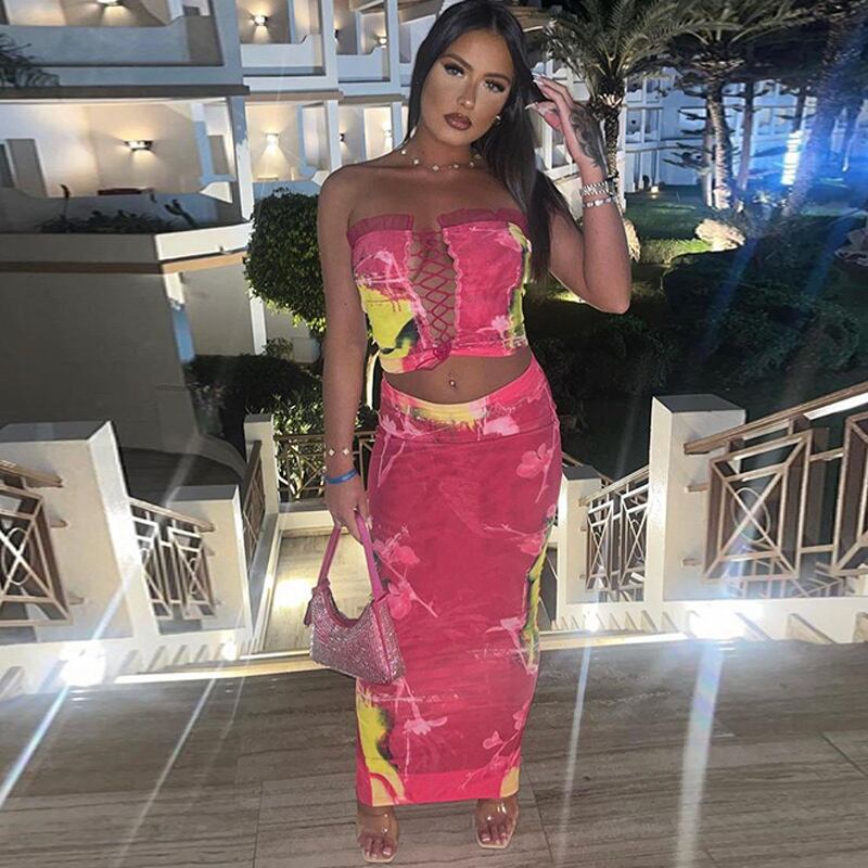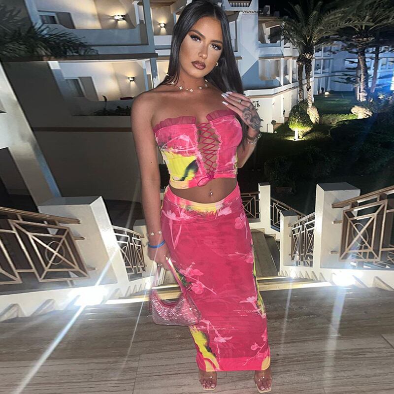 送料無料 Mozision プリントセクシーなツーピースセット女性レースアップストラップレスタンクトップとロングスカートセット中空アウトパーティードレスセット AE121288875289165610