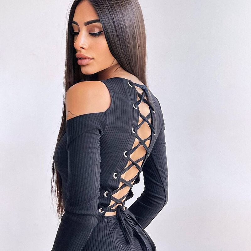 送料無料 Mozision セクシーな中空アウト包帯ミニドレス女性ローブ秋オフショルダーフルスリーブボディコンドレス Vestido オータム 秋物 AE121288840154276341