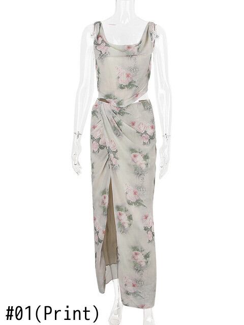 送料無料 Mozision シフォン プリント ドレス セット女性ノースリーブ コルセット クロップ トップと腿スプリット スカート マッチング セット パーティー 2 点セット AE121288877436534674 | 女性の為の通販サイト-fashion navi