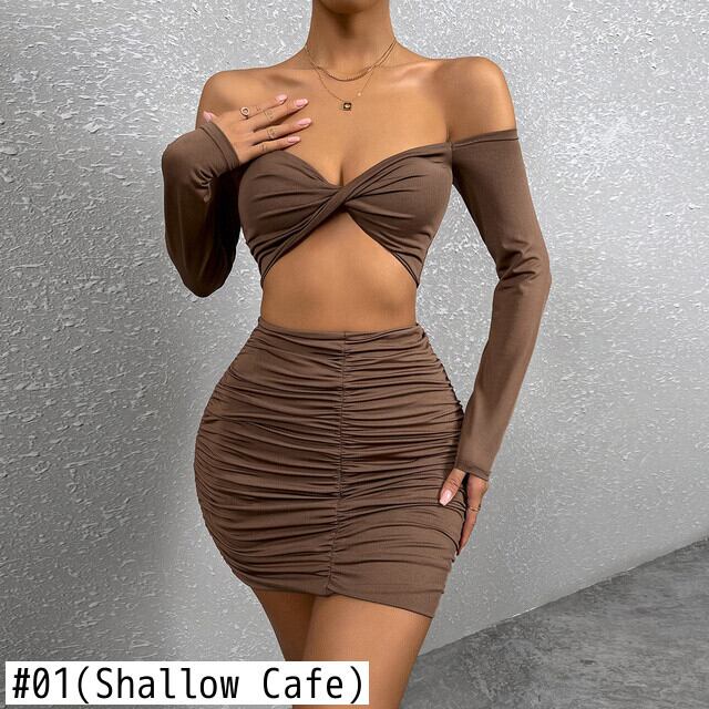 送料無料 Mozision ブラウンセクシーなツーピースセット女性衣装秋ストラップレスフルスリーブクロップトップとミニスカートセットシャーリングドレスセット オータム 秋物 AE12128882038292530