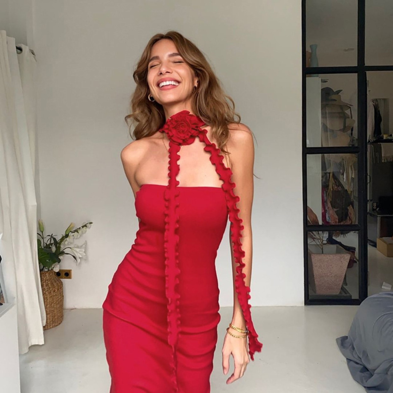 送料無料 Mozision ネクタイ花ホルター背中の開いたミディドレスの女性の夏のストラップレスの背中の開いたボディコンセクシーなロングドレス Vestidos サマー 夏物 フラワーデザイン AE121288852177050657 | 女性の為の通販サイト-fashion navi