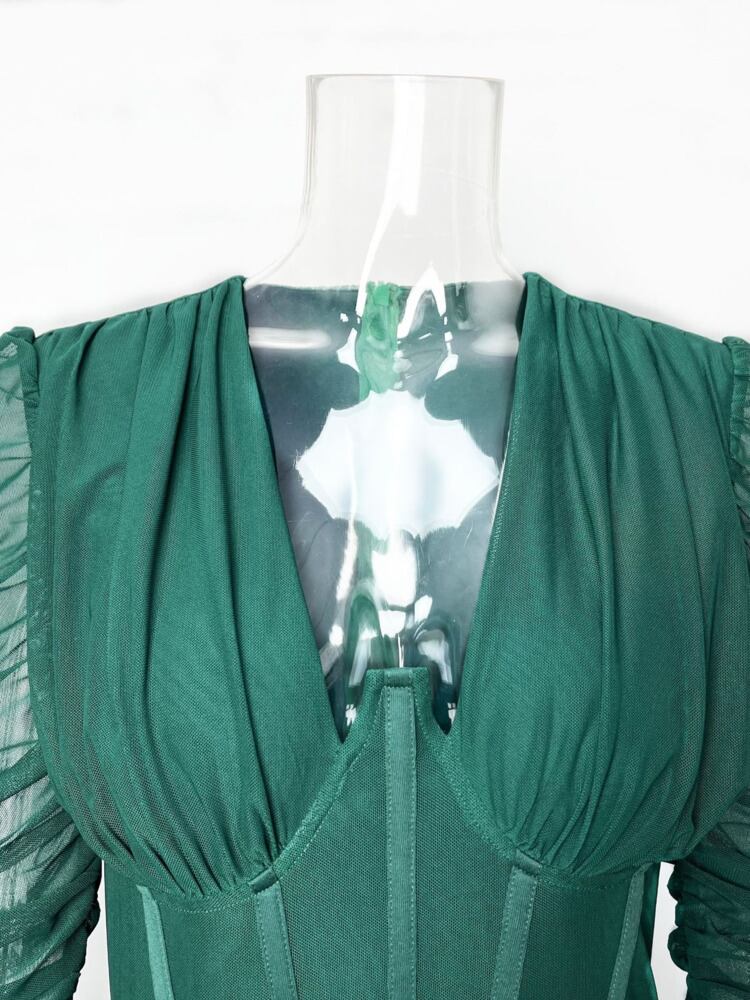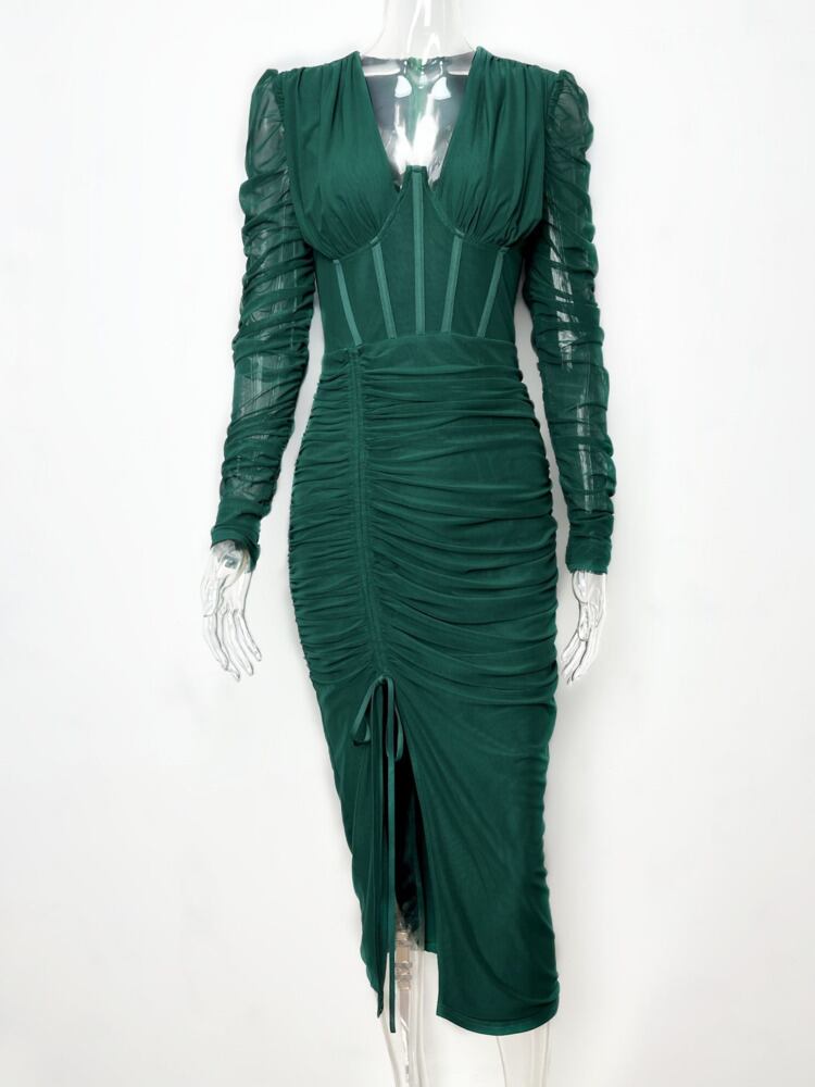 送料無料 Mozision メッシュシャーリングセクシーなミディドレス女性フィッシュボーン V ネック長袖巾着スプリットセクシーなクラブパーティーロングドレス Vネック AE121288877362994716