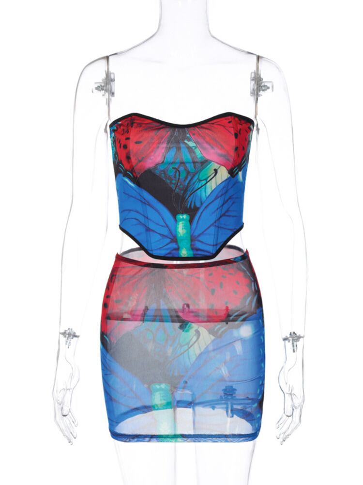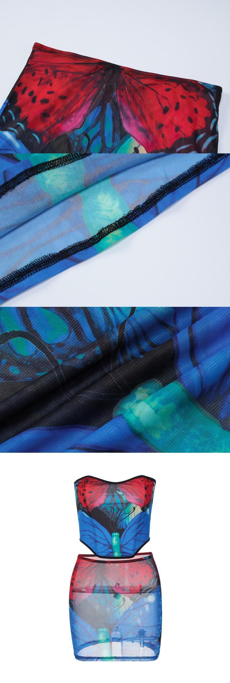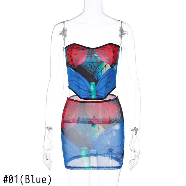 送料無料 Mozision メッシュプリントドレスセット女性ストラップレスクロップトップとミニスカートマッチングセットスキニーバックレスプリントツーピースセット AE121288817420643569