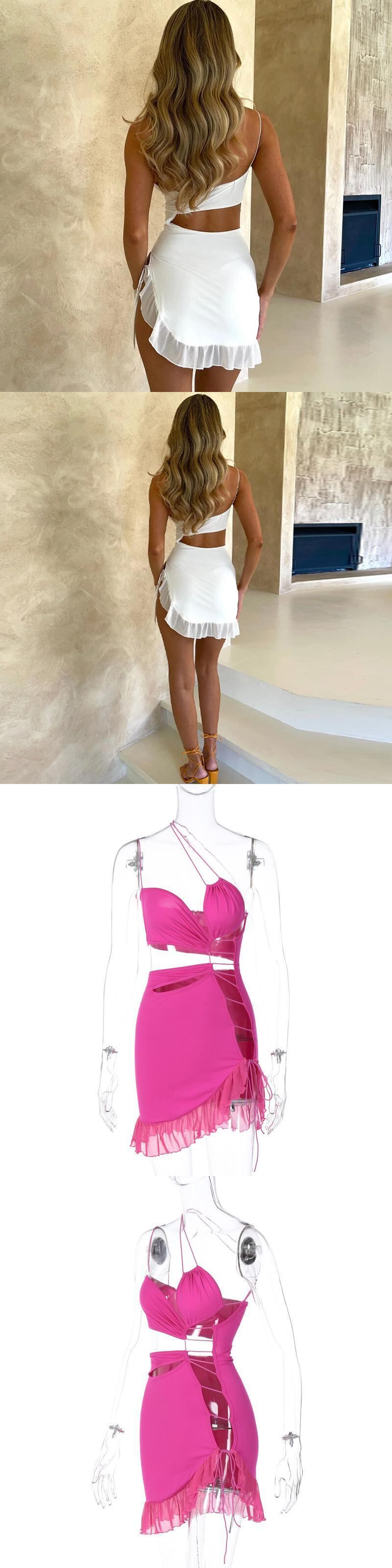送料無料 Mozision 中空アウトストラップレスフリルセクシーなミニドレス女性ローブ夏ワンショルダーストラップ背中の開いたクラブパーティードレス Vestidos サマー 夏物 AE121288898773353807