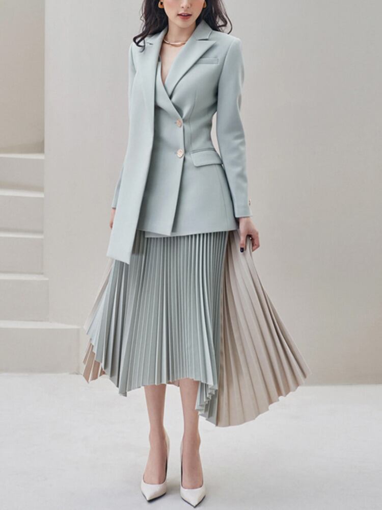 送料無料 Mozision 2023ダブルブレストスーツコートロングスリーブコントラストイレギュラープリーツスカートセット 長袖 AE121288831462336223