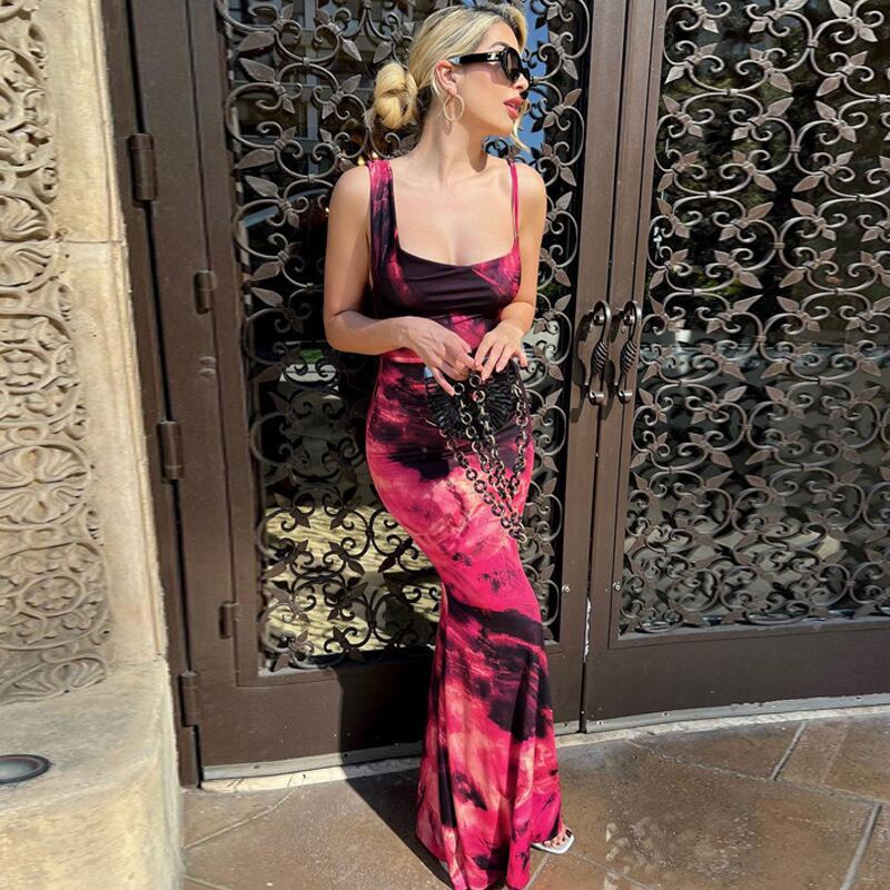 送料無料 Mozision プリント背中の開いたマキシドレスの女性 2023 スパゲッティストラップノースリーブ背中の開いたボディコンプリントロングドレス Vestidos AE121288881484681454