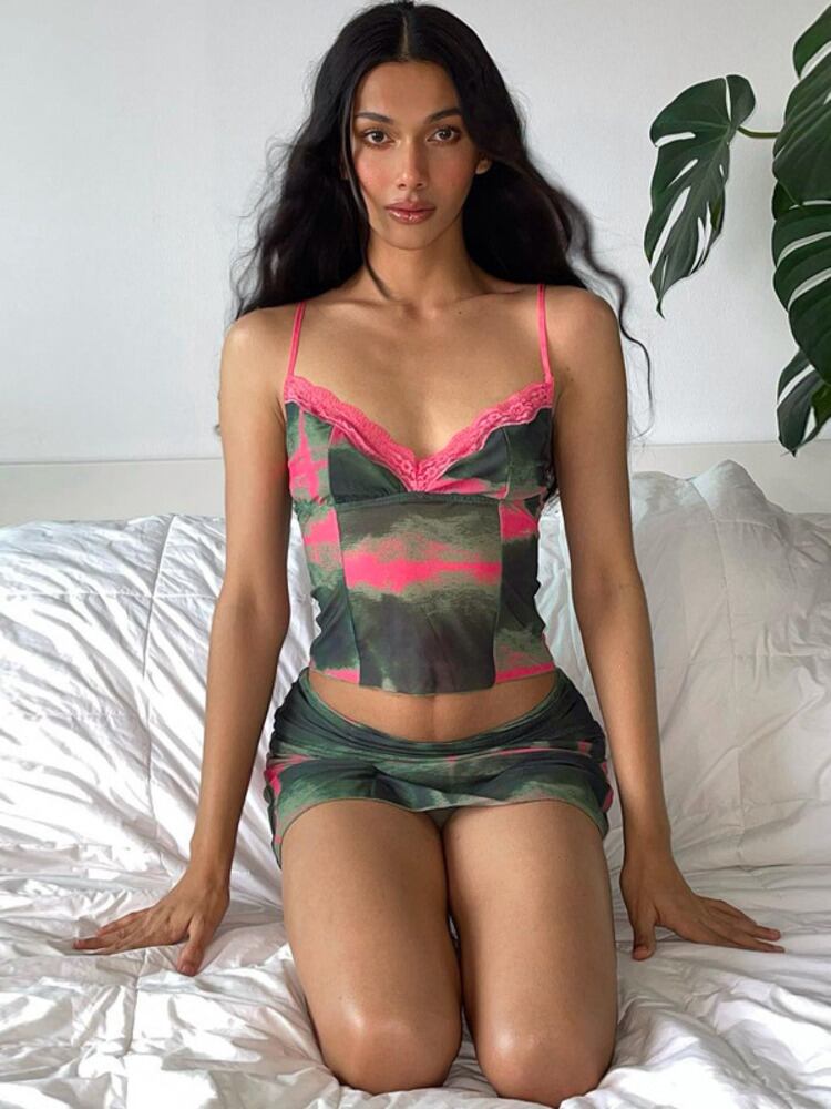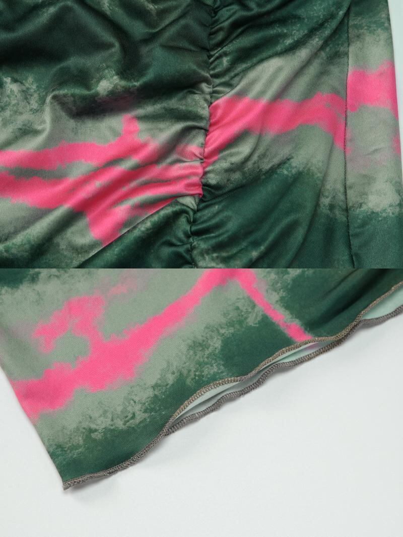送料無料 Mozision タイダイプリントツーピースセット女性衣装レースクロップトップとミニスカートマッチングセット V ネックプリントドレスセット Vネック AE121288860191909331